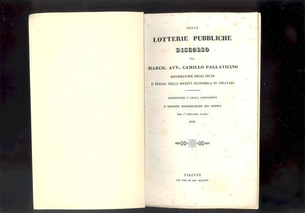 DELLE LOTTERIE PUBBLICHE DISCORSO DEL MARCH. AVV. CAMILLO PALLAVICINO<BR>RIFORMATORE DEGLI STUDI E PRESID. DELLA SOCIETA' ECONOMICA IN CHIAVARI.