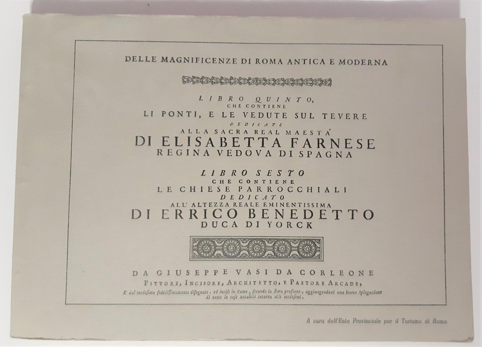 Riedizione integrale a cura dell'Ente Provinciale per il Turismo di Roma del libro V e VI dell'opera di Giuseppe Vasi "Delle Magnificenze di Roma Antica e Moderna" stampati nel 1754 e 1756. Roma, 1964 Copertina morbida editoriale con alcuni aloni e pieghe tagli leggermente ingialliti macchie di ruggine delle graffe al margine interno alla seconda pagina, interno in buono stato dimensioni cm 24,5 x 34