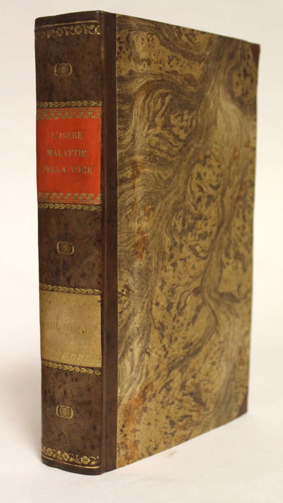 In 8° (mm 150x225). Occhietto, pagg. 768, con 2 tavv. Ripiegate f.t. incise in rame, di strumenti di indagine e per l'esecuzione di operazioni in loco.Mezza pelle con angoli, eleganti decori dorati, titoli impressi in oro su doppio tassello.Assai interessante trattato, De L'Isère il pioniere, della moderna fonologia e ortofonia, l'autore viennese, cavaliere della Legion d'Onore, (1797 -1851 morirà per ironia della sorte, di una lunga malattia che lo privò dell'uso della parola) dedica tutta la vita agli studi della fisiologia degli organi foniatrici e soprattuto i vizi di pronuncia e balbuzie; nel 1830 crea l'Istituto Ortofonico di Parigi. La presente opera, una completa monografia delle funzioni e delle malattie degli organi della voce, mette in luce la manchevolezza degli studi scientifici su questo argomento, a cui, fino ad allora, nessun medico si era dedicato; perciò la fisiologia, la patologia e la terapeutica di L'Isère, daranno vita alla moderna fonologia; la traduzione del Dott. Maggesi è arricchita di un appendice di memorie aggiunte, dei dott. ri Bennati, che redige, Studi fisiologici e patologici sugli organi della voce umana 1831; Ruschi e Malgaigne De Charmes, che redige la Nuova teoria della voce umana.Ottimo esemplare in barbe