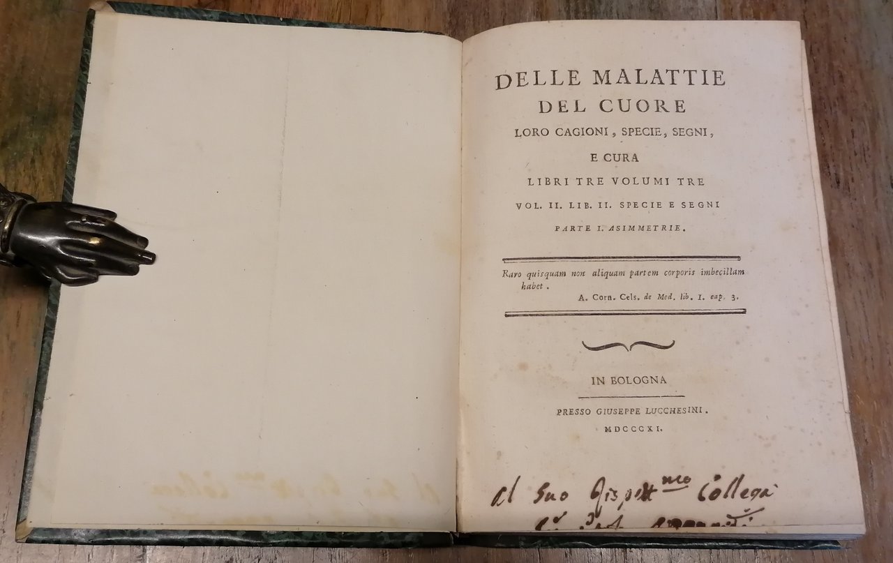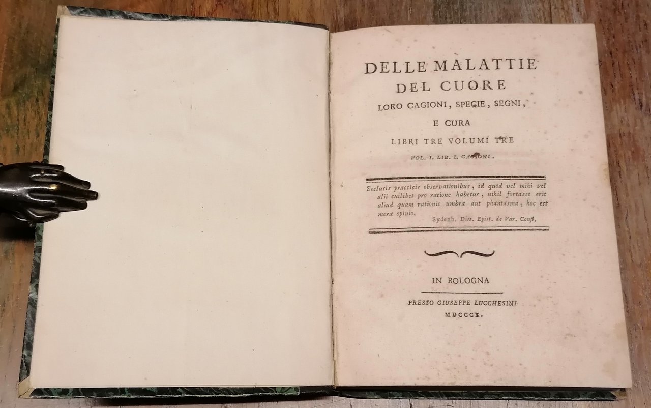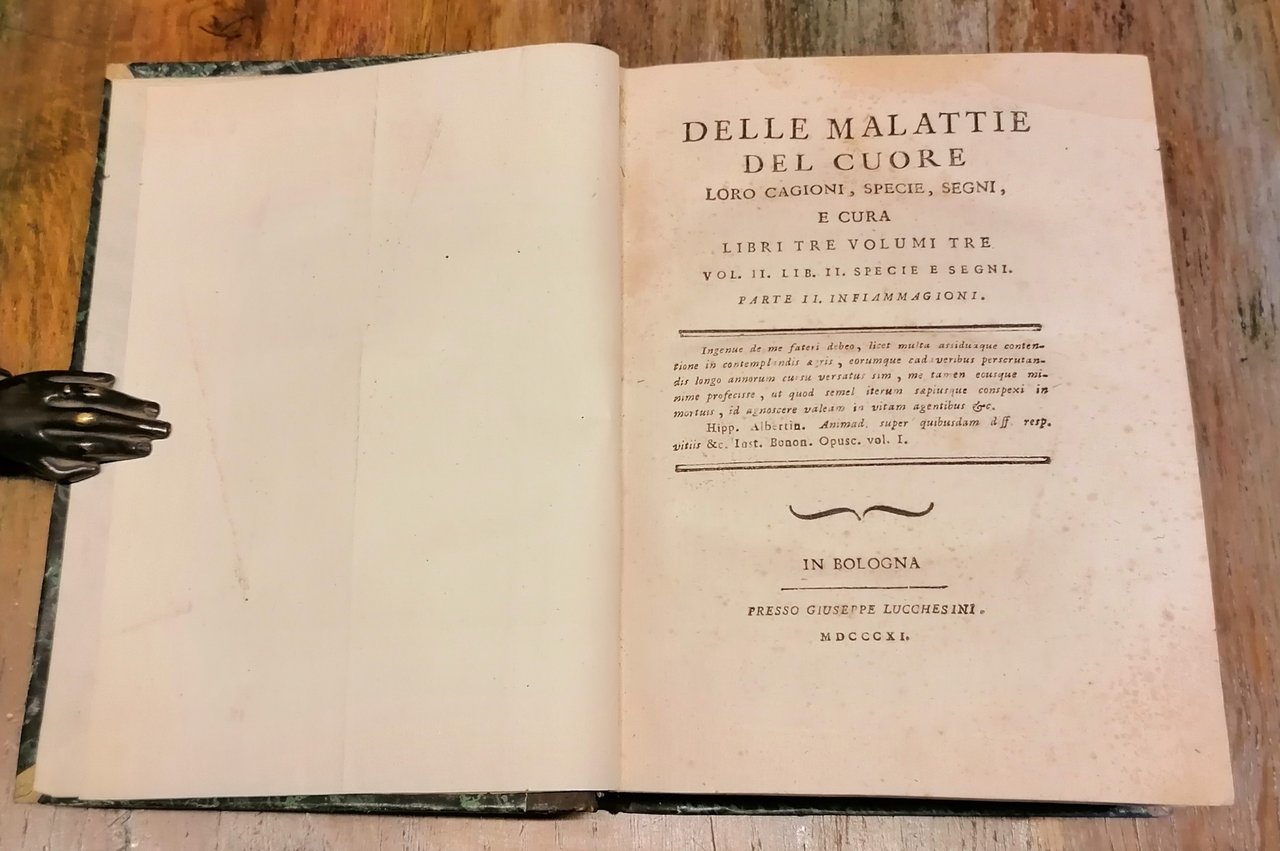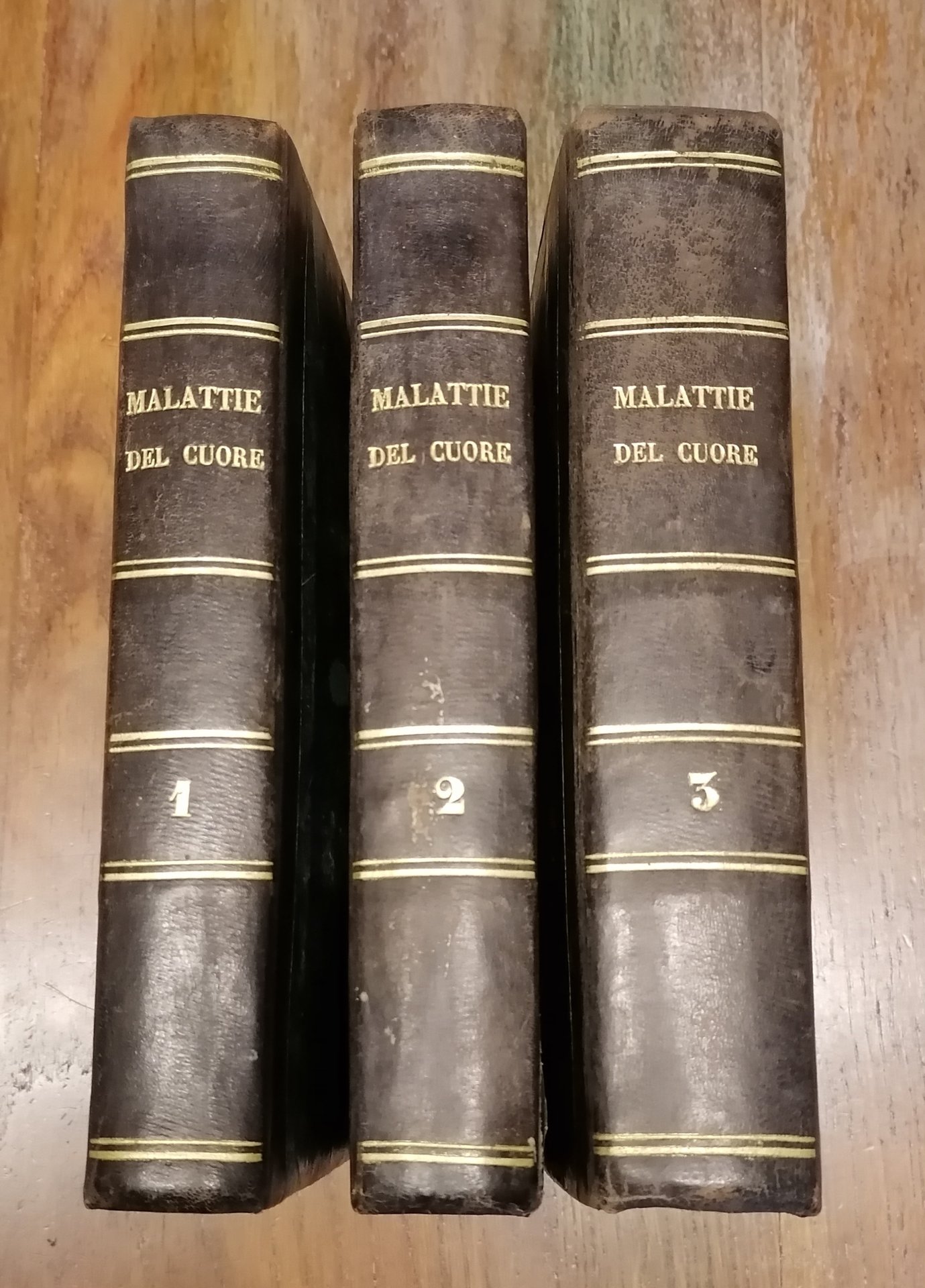 (Medicina - Cardiologia - Cardiopatie) Tre volumi in 8°, legatura tardo ottocentesca in mezza pelle nera con titoli e filetti impressi in oro al dorso, carta marmorizzata monocroma ai piatti, pp. CIV,215,(1) ; CXXXII,249,(1) ; 473,(1). Una dedica coeva al margine inferiore del frontespizio del secondo tomo, parzialmente rifilata dal legatore. Volumi solidi con alcune tracce di ossidazione, mai invasive e dovute alla qualità della carta, peraltro esemplare ben conservato di questo importante trattato sistematico sulle malattie del cuore.