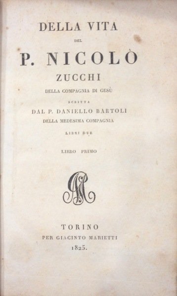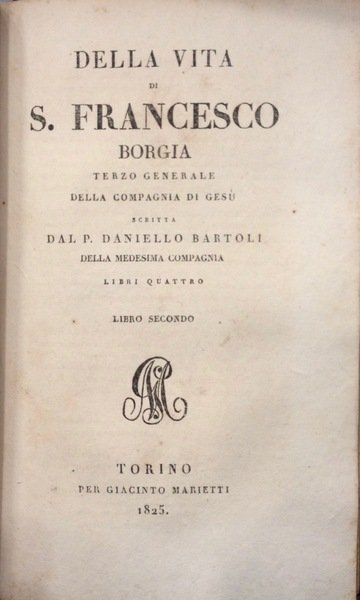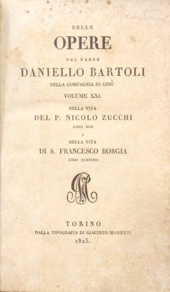 Il volume � il XXI della collana Delle opere del padre Daniello Bartoli della Compagnia di Ges� e racchiude due opere: Della vita del P.Nicol˜ Zucchi (prima parte, pp 92; seconda ed ultima parte, pp 103) e l'opera Della vita di S.Francesco Borgia (prima parte, pp 72; seconda parte, pp 88; terza parte, pp 80; quarta ed ultima parte, pp 107). Cartonato rigido moderno, con tassello e titolo al dorso. Argomenti: Compagnia di Ges�, Biografie