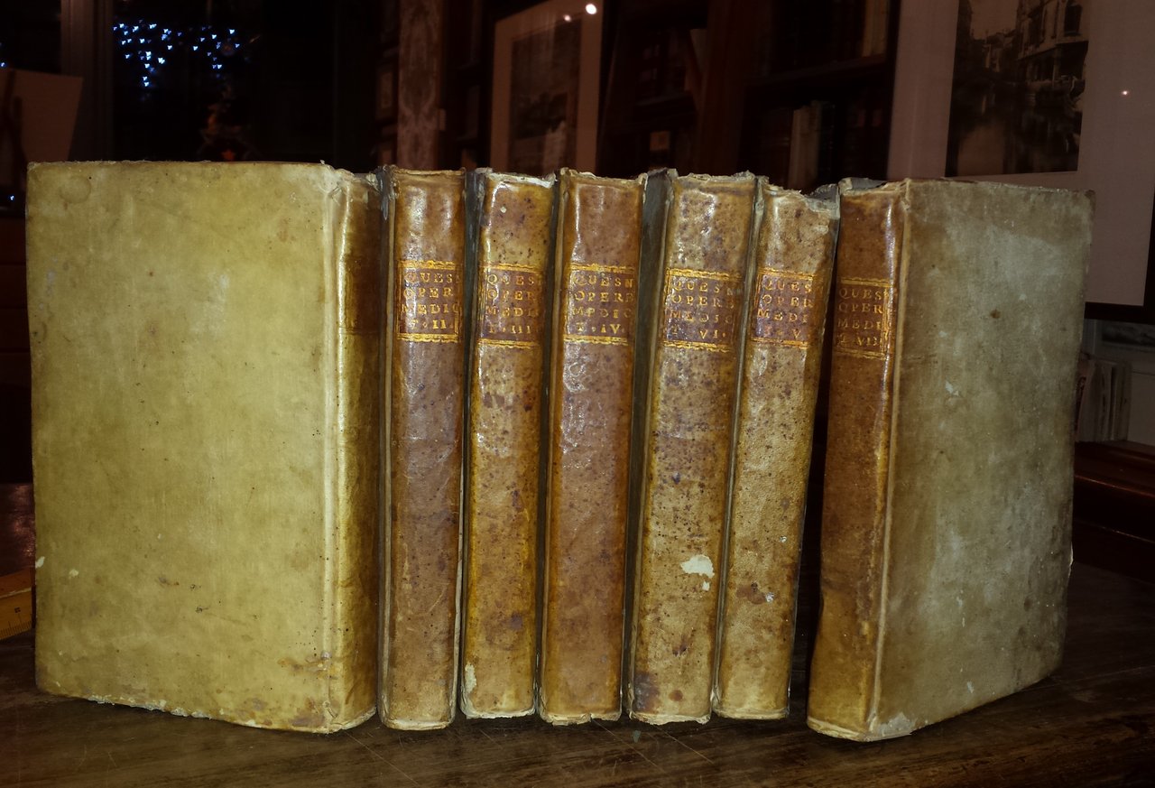 In-8 (18 cm) 7 voll (4) VIII 225; (4) 274; VII (1) 237 (1); 295 (1); VI 282; 342; VII 245 (1). Piena pergamena coeva. Numerose fioriture. Al quinto volume (primo del salasso) errore di numerazione pagine: saltate le pagine dalla 157 alla 160. Quesnay Francois (Méré, 4 giugno 1694 – Versailles, 16 dicembre 1774) è stato un economista, medico e naturalista francese. Fu il maggior rappresentante della fisiocrazia, la dottrina secondo la quale l'agricoltura è il solo settore che consente un aumento reale della ricchezza e quindi la Francia, grazie all'ampia disponibilità di terreni coltivabili, avrebbe dovuto privilegiare l'agricoltura piuttosto che le attività manifatturiere.