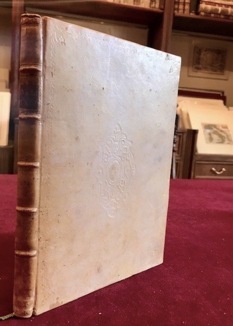 4to (cm. 22,2), 131(1) pp. Frontespizio interamente inciso entro cornice floreale con due puttini. Tre graziose vignette e due grandi capilettera calcografici n.t. Legatura coeva in pergamena rigida con nervi e titolo oro su tassello dipinto al ds. Fregi impressi a secco ai piatti. Tagli colorati. Carte di guardia xilografate. Esemplare in ottimo stato di conservazione. Prima e unica edizione. Per la paternità dell'opera si veda Melzi (II, 285): ‘Autore di questo stranissimo libro è il P. Francesco Soldini, carmelitano, lettore di filosofia nel Seminario d'Arezzo’, autore, tra le altre cose del ‘De anima brutorum commentaria’, messo prontamente all'Indice, e di una celebre giuda illustrata del giardino di Boboli a Firenze. Cipolla Taffino, cui l’opera è dedicata, è padre Negro di Voghera, professore di Storia della Chiesa nel medesimo seminario.