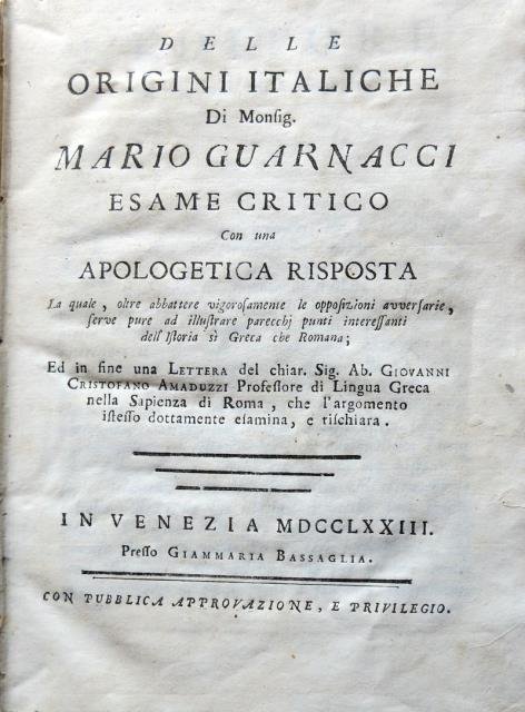 Delle origini italiche. Di Monsig. Mario Guarnacci. Esame critico con una apologetica risposta. La quale, oltre abbattere vigorosamente le opposizioni avversarie, serve pure ad illustrare parecchj punti interessanti dell'Istoria sì Greca che Romana; Ed in fine una lettera del Chiar. Sig. Ab. Giovanni Cristofano Amaduzzi Professore di Lingua Greca nella Sapienza di Roma, che l'argomento istesso dottamente esamina, e rischiara.