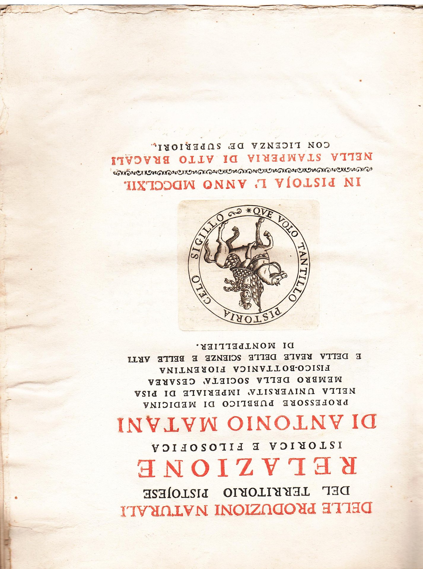4° (cm. 29, x 22,5), pp. VII-204. Frontesp. in rosso e nero con sigillo della città, con la bella "Carta topografica del territorio pistoiese" ripieg. f.t. incisa in rame di cm. 41 x 52 dis. da Francesco Bracali, assai decorativa, e due tavole ripieg. ("Affinità dei corpi naturali" e "Osservazioni meteorologiche fatte in Pistoja.", e varie incisioni calcografiche n.t. di monete e figure in xilografia. Prima edizione di questo interessante trattato dedicato a Pistoia e al suo territorio, diviso in quattro parti, la prima descrive brevemente la città e i luoghi circostanti, la seconda ne tratta i minerali, le acque e le meteore, la terza le piante, la quarta gli animali tipici. Inghirami, II-31. Esempl. molto buono, a pieni margini e con barbe (qc. rara lieve fiorit.).