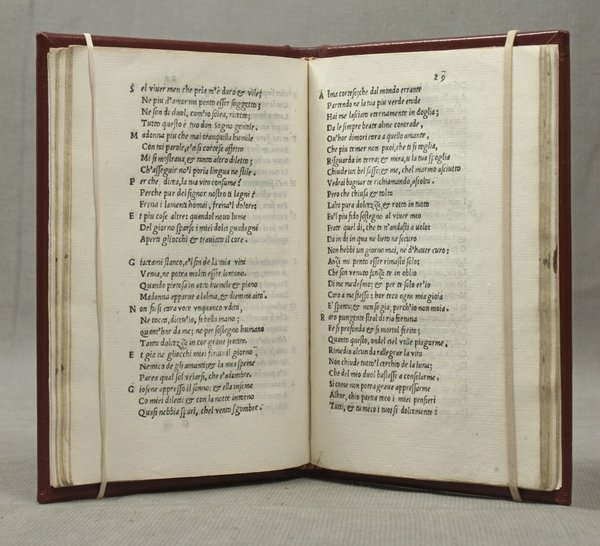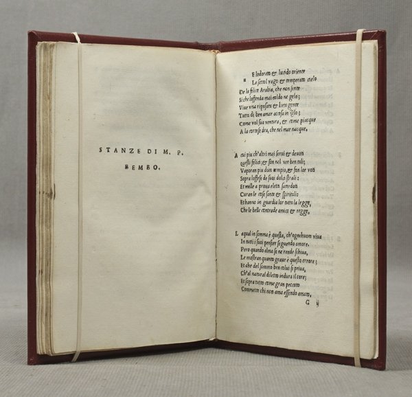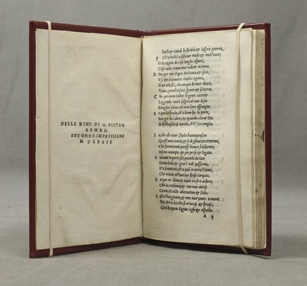 In-8ø; 44 cc., 14 cc. nn. (nell'ultima parte vi sono le stanze del Bembo); legatura moderna in tutta pelle rossa. Esemplare con ampi margini. Interessante edizione (in modo rapido e alquanto e impreciso ricordata dal Brunet I 764), probabilmente uscita dagli stessi torchi di Comin da Trino a cui dubitativamente viene assegnata quella del 1540 che Š uguale alla presente. Se si considera che le due prime impressioni sono entrambe del Sabio (1530 e 1535), questa pu• definirsi non a torto "seconda impressione". Censimento B 1190. Manca alla British Library.