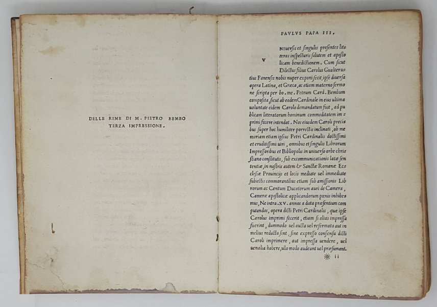>in-4, pp. (8), 180 num. e 4 nn. (che dovrebbero essere poste dopo p. 152 sono poste in fine; anche le 153-164 si trovano posposte alla p. 180, collocazione d'origine nel presente esempl.), bel carattere corsivo, leg. coeva p. pergamena, titolo ms. parzialmente leggibile al dorso. Precedono il testo il Privilegio di papa Paolo III e la dedica del Caro al cardinale Alessandro Farnese. Pregevole terza edizione delle Rime (prima Venezia, Sabbio, 1530) curata da Carlo Gualteruzzi e riveduta da Annibal Caro. Questa rara edizione è arricchita da una serie di rime inedite, in quanto non approvate dal Bembo: inserite separatamente rispetto al testo originale sono precedute da un Avviso probabilmente dell'editore (p. 165). Nello stesso 1548 apparvero anche due edizioni del Giolito a Venezia; curioso che tutte e tre le edizioni del 1548 riportino con varianti l'ultimo verso de ''La mia fatal nemica''. Bell'esemplare a grandi margini , puro e completo dei ff. bianchi (lievi macchie brune ai margini del fascicolo D). Gamba 141: ''Edizione veramente bella e da tenersi in estimazione''. Adams B-504. BMC 81.