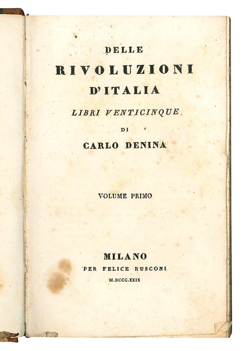 Carlo Denina (Revello, 1731 - Parigi ,1812) fu storico e poligrafo. Il suo capolavoro, le Rivoluzioni d'Italia (1768-72), gli valse la cattedra di eloquenza presso l'Università di Torino (1770). Caduto in disgrazia e destituito, su invito di Federico II, si recò a Berlino. Nel 1804, a seguito di un incontro con Napoleone, avvenuto a Magonza, fu nominato bibliotecario a Parigi.