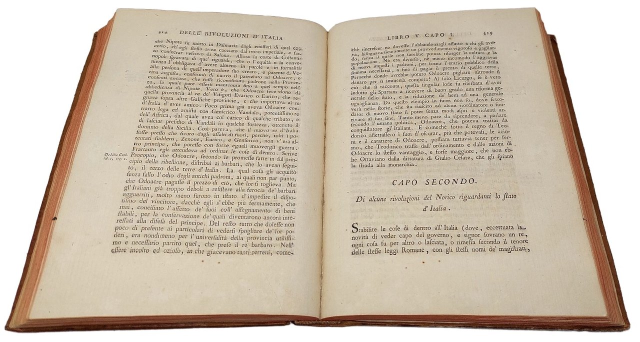 >3 volumi in-4, pp.XII- 464, XVI-404, XI-414, legatura coeva in p. vitello, dorsi ornati con fregi in oro, titolo in oro su doppio tassello, tagli rossi (qualche difetto ai piatti). Prima edizione del lavoro più valido del Denina, illustre e complessa figura di storico e umanista piemontese.Con la presente opera egli volle dare un contributo di "storiografia filosofica"che analizzasse non solo i fatti politici, ma tutti i fattori geografici, antropologici e sociologici che determinarono i destini dei diversi Stati italiani. Esemplare assai bello. Brunet, II, 595 ''cet ouvrage estimé a été souvent réimprimé''.