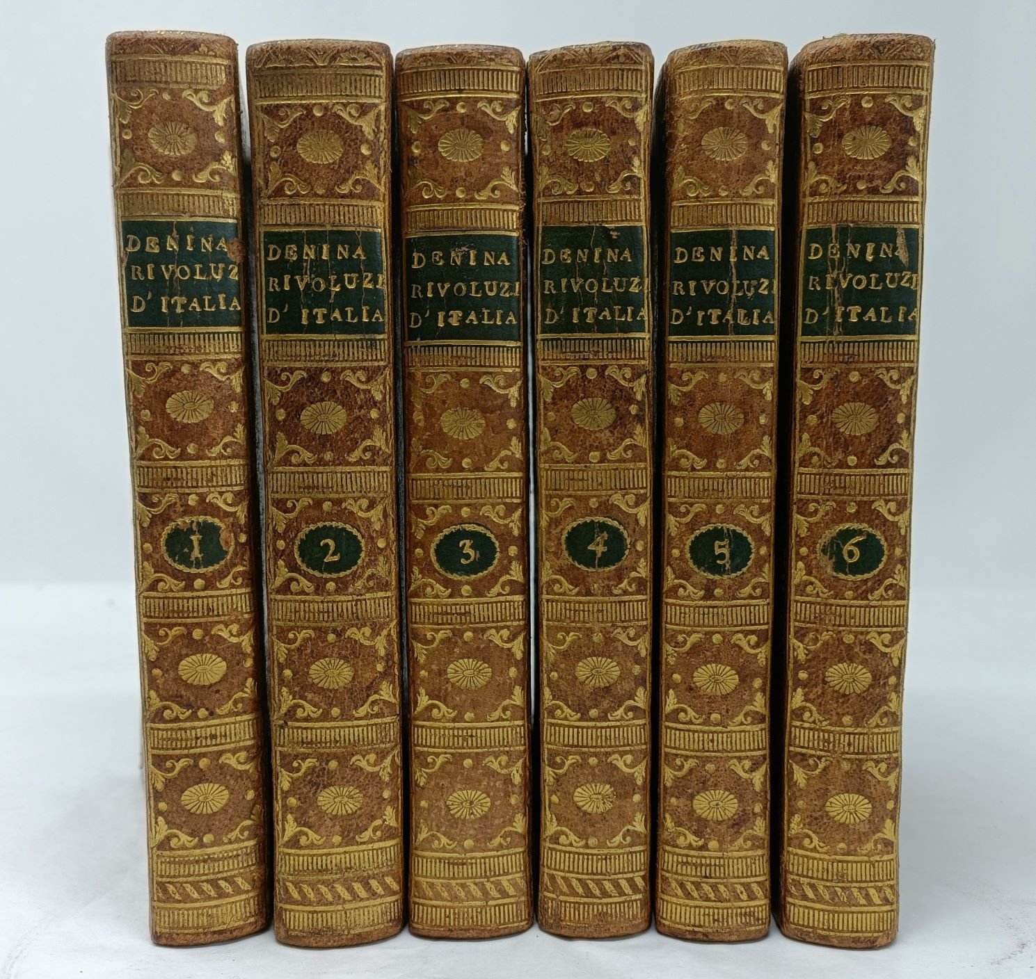 >6 vol. in-16, pp. complessive 2.200 circa, legatura del tempo p. pelle marmorizz., dorsi con ricchi fregi oro e duplice tass. in marocchino verde per il tit. ed i numero del vol. Le prime 16 pp. contengono la vita di Denina scritta dal barone Vernazza che termina con una fine inc. dello Stagnon. Seconda edizione in parte originale (la prima apparve nel 1769-70): infatti è contenuta qui per la prima volta l'aggiunta del venticinquesimo libro che integra l'opera per il periodo 1713-1792 (''Continuazione ...sotto il titolo d'Italia moderna'', pp. 96, in fine all'ultimo vol.). Opera tra le più valide ed impegnative della produzione del grande storico piemontese (Revello, presso Saluzzo, 1731 - Parigi 1813) ed una delle più importanti di tutta la storiografia del Settecento, comprendente la storia italiana dall'epoca etrusca fino alla pace di Utrecht, analizzandone «non solo i fatti politici, ma anche tutti i fattori geografici, antropologici e sociologici che determinano i destini degli uomini e delle Repubbliche». Magnifico esemplare Non in Manno. Diz. Biogr. Ital. 38, p. 723 e segg.
