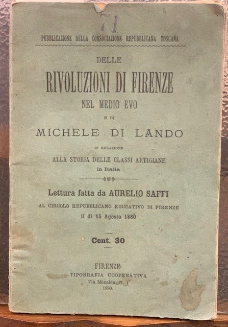 DELLE RIVOLUZIONI DI FIRENZE NEL MEDIO EVO E DI MICHELE DI LANDO IN RELAZIONE ALLA STORIA DELLE CLASSI ARTIGIANE IN ITALIA. Lettura fatta da Aurelio Saffi al Circolo Repubblicano Educativo di Firenze il dì 15 agosto 1880.