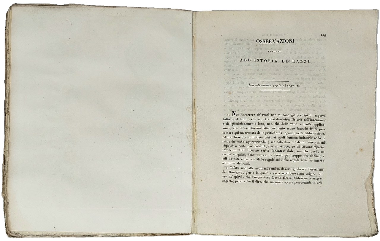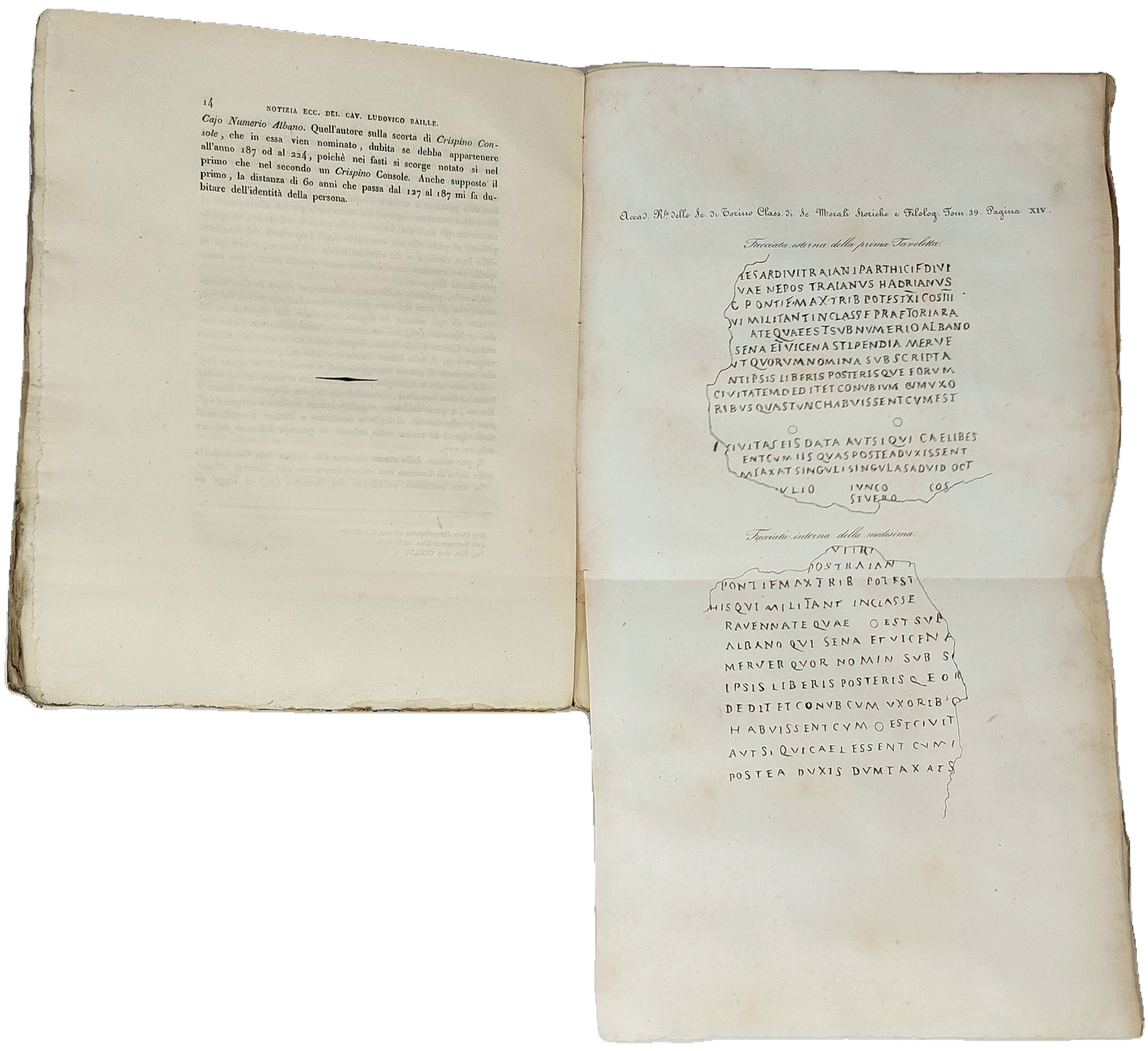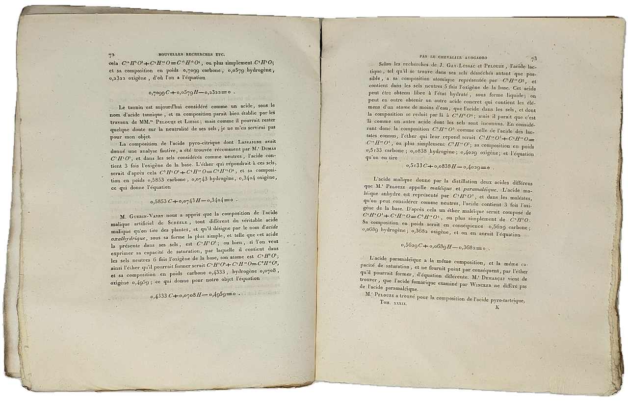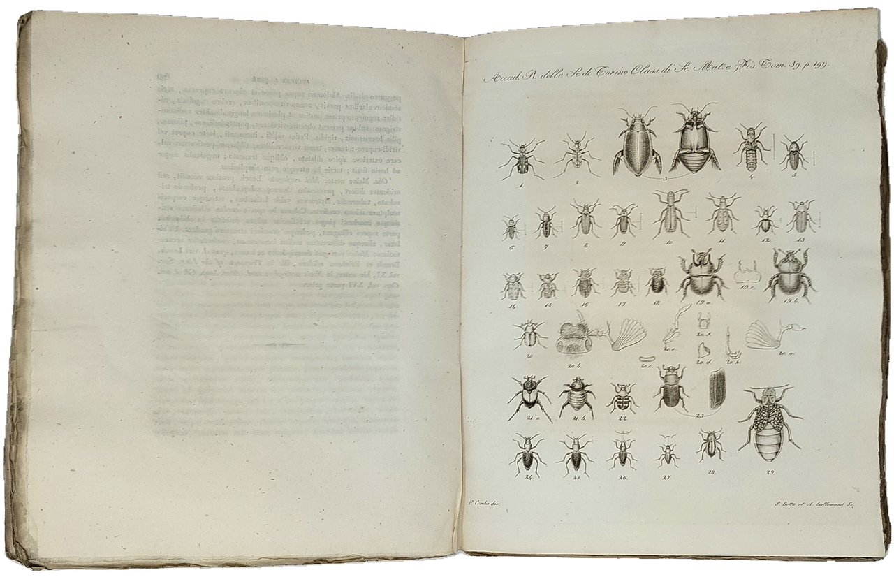>in-4, pp. XLVIII, XIV, (2), 283, (2), 446, (2); broch. muta coeva titolo al dorso. Numerose tavv. in litogr. a soggetto scientifico (24 riproducono piante rare della regione del Cile) e numismatico f.t. Il volume contiene importanti memorie della ''Classe di scienze fisiche e matematiche'' e della ''Classe di scienze morali, storiche e filologiche''; alle pp. 57-154 si trova in edizione originale un studio importante di Amedeo Avogadro intitolato ''Nouvelles recherches sur le pouvoir neutralisant de quelques corps simples''. Alcune delle ''Memorie'' presenti hanno attinenza con la storia locale: ''Mémoire sur une chaux sulfatée de Piobesi de Guarène...'' di Lavini, ''Osservazioni geognostiche e mineralogiche intorno ad alcune valli delle Alpi del Piemonte'' di Angelo Sismonda (con una carta geogr. a colori ripieg. f.t.), ''Monete ossidionali del Piemonte'' di Cas. Promis, (con 5 tav. f.t.), ecc. Esemplare a pieni margini.