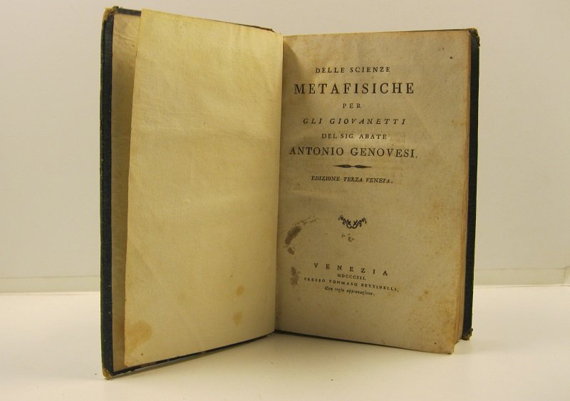 In 16, pp. XII + 380. In tre parti: cosmologia, teologia, antropologia. M. pl. coeva con fr. oro al d. Con danni al d.e agli angoli dei piatti. Piccoli fori di tarlo da pag. 53 a 74. Con qualche annotazione a matita da pag. 316 a 324. Piccola gora al frontespizio. Lievi fioriture. Terza ed. veneziana del famoso trattato apparso per la prima volta nel 1766. Il Genovesi (Castiglione 1712 - Napoli 1769) ebbe a Napoli la cattedra di economia politica (la prima fondata in Italia) e fu il primo ad usare la lingua italiana invece della latina nelle lezioni universitarie.