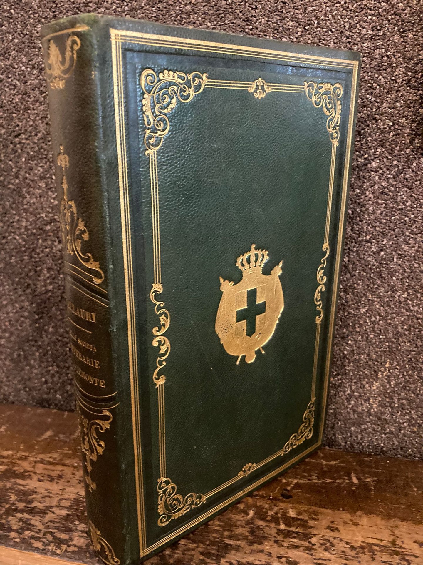 In-8° (260x170mm), pp. 322, (1). Splendida legatura coeva in piena pelle verde con arma dei Savoia impressa in oro sui piatti, entro ricche bordure, titolo e fregi in oro sul dorso. Prima edizione, in legatura da amatore, di questa referenziale opera sulle società letterarie e le accademie dell'interezza del territorio piemontese. In fine, tavole alfabetiche delle varie società letterarie, delle città piemontesi in cui vennero istituite, delle materie. Il Vallauri (Chiusa Pesio, Cuneo, 1805-Torino, 1897) fu professore di eloquenza latina e italiana nell'ateneo torinese, deputato, senatore dal 1882 nelle file cattoliche e filologo classico, curatore di edizioni di Plauto, Orazio, Cicerone, ecc. Manno, I, 3198. Cfr. Tommaso Vallauri nella società e nella cultura dell'Ottocento, a cura di Giuseppe Griseri, Cuneo, 1999.