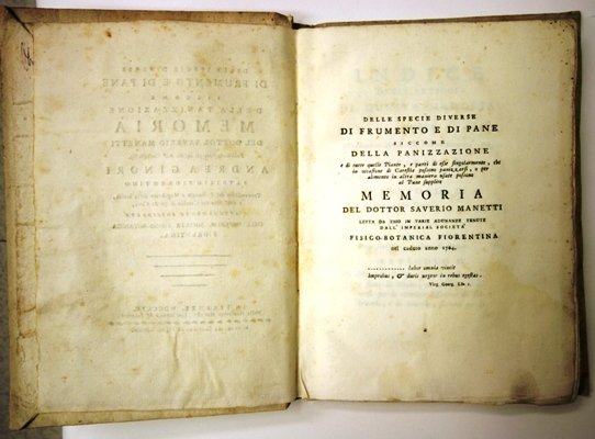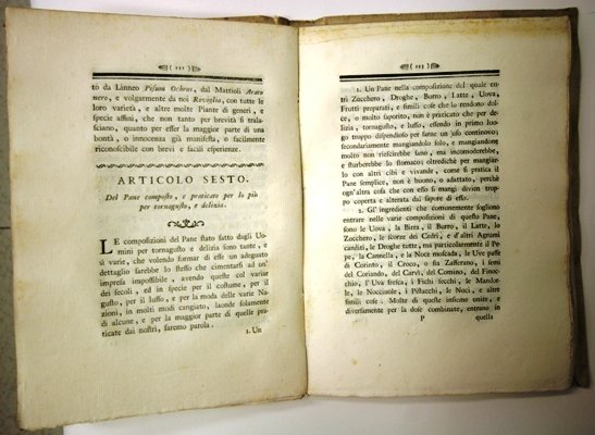 ".siccome della panizzazione e di tutte quelle piante e parte di esse singolarmente, che in occasione di Carestia possono panizzarli, o per alimento in altra maniera usate possono al pane supplire memoria." Rara I^ edizione originale. Contiene, nelle sue 237 pagine, più di un centinaio di ricette e spiegazioni su come panificare in modo alternativo. Esemplare<BR> completo, rilegatura originale con copertina cartonata, interno fresco in ottimo stato, Da collezione !
