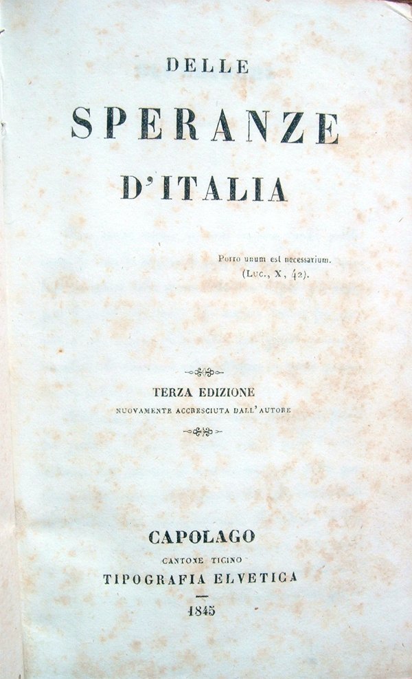 In-16° (16,3 x 10,2 cm), pp. XXXI, (1), 498, (6), legatura coeva in cartone rigido ricoperto di carta, con titoli su tassello in carta al dorso. Normali segni d'uso alla legatura: in particolare una piccola mancanza di carta (di cm 1,4x0,8) al dorso e piccole abrasioni alle cuffie. Al verso della guardia anteriore, etichetta pubblicitaria in carta, incollata nell'angolo superiore sinistro, dei "Ponti Frères - Bijoutiers, Quinquailliers, Obticiens & Phisiciens à Berne, Grande Rue n. 175". Segni d'umido alle pagine, per il resto buon esemplare. Indice: Gli Editori; Dedica prima; Dedica seconda; Occasione di questo scritto; Capo I. L'ordinamento politico presente dell'Italia non è buono; Capo II. Di quattro ordinamenti sperati - e prima del regno d'Italia; Capo III. Di un regno d'Italia austriaco; Capo IV. Delle repubblichette; Capo V. Della considerazione degli Stati presenti; Capo VI. La confederazione è impossibile finché una gran parte d'Italia è provincia straniera; Capo VII. Breve storia dell'impresa d'indipendenza, proseguita sempre, non compiuta mai per XIII secoli; Capo VIII. Eventualità future dell'impresa; Capo IX. L'eventualità più promettitrice; Capo X. Come si possano aiutare i principi italiani; Capo XI. Come si possano aiutar tutti gli italiani; Capo XII. Breve storia del progresso cristiano; Capo XIII. Il progresso cristiano presente, ed accrescimento che ne viene a tutte le speranze italiane; Appendice. Se e come sia sperabile una lega doganale in Italia; Nuova appendice. A molte critiche una risposta: fatti nuovi.