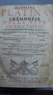 VENEZIA, BAREZZO, 1643. Ampliato con le Historie de Papi moderni da Sisto IV sino a Paolo V scritte dal P.F. Onofrio Panvinio Veronese, da Antonio Cicarelli da Foligno, e da D. Gio. Stringa Venetiano; con l`annotazioni del Panvinio e con la Cronologia Ecclesiastica dello stesso ampliata dal R.M. Bartolomeo Dionigi da Fano, e da D. Lauro Testa, perfezionato in questa impressione con l`Aggiunta delle vite di Gregorio IV e di Urbano VIII e con un supplimento di venti anni alla Cronologia di D. Francesco Tomasuccio. In 8∞: pp. 12 + 74 + 2 + 912 + 14 + 222. Frontespizio con bella marca tipografica (riparato), tarletti al margine interno, margine superiore sobrio. Piccolo strappo alla pag. 401 con parziale perdita del testo. Ritratti dei Pontefici incisi in xilografia con relativi stemmi di famiglia, incisioni, capolettera, finali n.t. Leg. in mz. pergamena, piatti con lievi mende, tasselli al dorso, sguardie rifatte. Fioriture sparse.