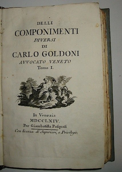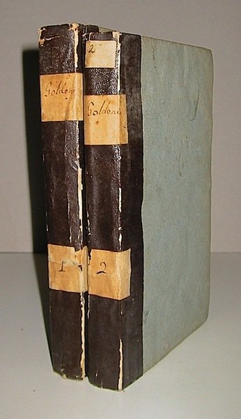 8vo (cm. 22,5), 2 Voll., 1 c.nn., 270 pp.; 1 c.nn., 287(1) pp. Antiporta incisa su rame f.t. e graziosa vignetta al frontespizio di ciascun volume. Legature in cartoncino celeste con ds. anticamente ricoperti in tela bruna. Titoli ms. su tasselli cartacei. Esemplare in barbe con sporadiche fioriture, un pallido alone al margine inferiore interno bianco di circa metà del primo Tomo e qualche piccola traccia di tarlo che non interessa il testo. Prima edizione della raccolta di queste argute composizioni poetiche che lo stesso Goldoni (1707-1793) soprannominò scherzosamente nell’introduzione le sue ‘barzellette’ e che sono essenziali per illustrare pienamente la straordinaria capacità creativa del celebre commediografo. Le antiporte sono entrambe incise da Antonio Baratti su disegni di Novelli, in particolare su una delle due si vede il Goldoni stretto in assedio da una moltitudine di poeti che da ogni parte accorrono offrendogli sonetti, canzoni e poemetti. Morazzoni, 88 e 234; Gamba, 2277 (in nota).