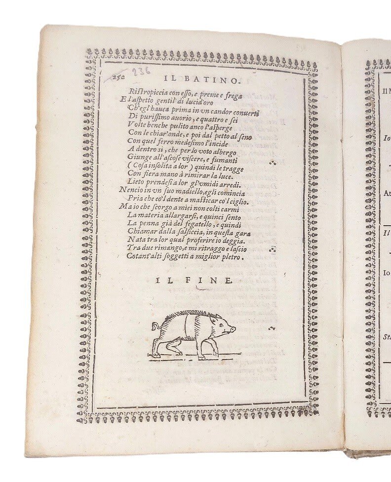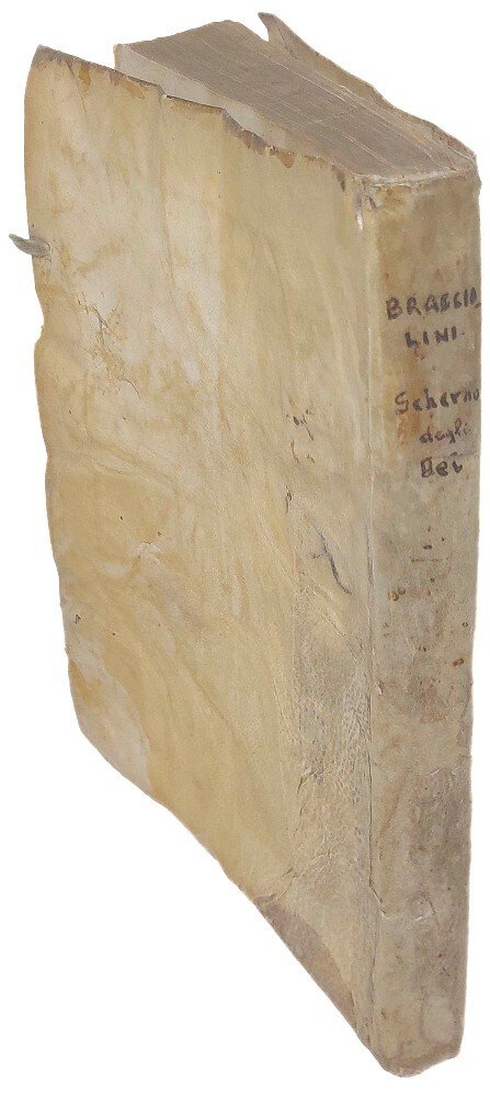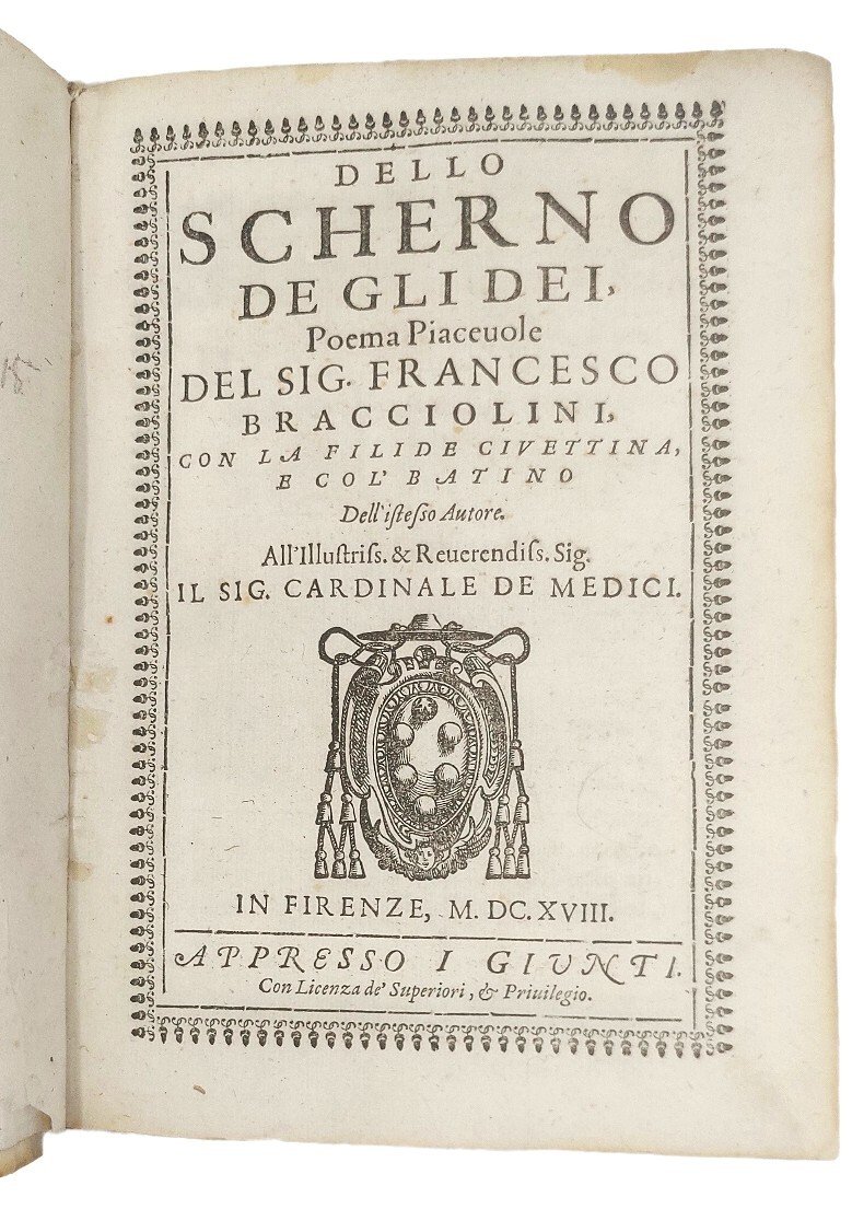 >in-4 (215x150 mm), pp. (16), pp. 236 (per errore num. 252), (4, le prime 2 con approvazione ed errata, le altre bianche), leg. coeva p. perg., tit. ms. al dorso. Ogni pagina riquadrata con bordura di fregi tipogr.., arma del Cardinale Medici sul titolo, cui l'opera è dedicata da Gio. Maria Gherardi, che ne curò la pubblicazione; fregi ed iniz. ornate e fig., curioso il finalino all'ultima pag. raffig. un maialino, il protagonista del poemetto in versi sciolti "Il Batino". Prima edizione, comunemente ritenuta tale da molti critici (Gamba, Quadrio, Parenti, ecc.), anche se da alcuni bibliografi moderni è considerata originale l'edizione di Venezia, Paolo Guerigli, essendo stata stampata qualche mese prima (cfr. Cat. Vinciana 2884 e Graesse I, 517). Ai 14 canti di questo poema burlesco, altri 6 saranno aggiunti per la prima volta nell'ediz. romana di Mascardi del 1626. Bell'esemplare, assai puro. Gamba, 1815: «il poema, venne corretto da P. Petracci, e pubblicato da Giammaria Gherardi...E' preceduto da un Dialogo in prosa del Bracciolini tra Talia e Urania col titolo: Thalia, etc. Contiene inoltre la Filide civettina, in ottava rima, ed il Batino in versi sciolti». Cat. Vinciana 2885. Michel-Michel I, 208.