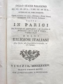 Dello stato religioso. Opera tradotta tradotta con tutta esattezza e senza veruna alterazione sulla seconda edizione fatta in Parigi [.] ed arricchita di annotazioni con le quali si dimostra l'utilità recata dalli religiosi italiani alla Chiesa, alla Repubblica letteraria, ed alla Società.