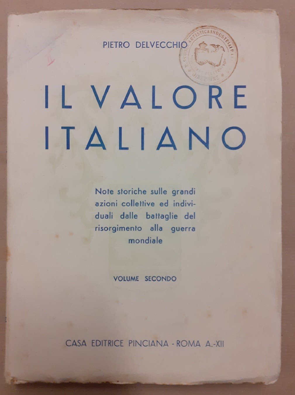 Pietro Delvecchio, Il valore italiano. Note storiche sulle grandi azioni collettive ed individuali dalle battaglie del Risorgimento alla Guerra mondiale. Volume secondo, Casa Editrice PInciana, Roma a. XII s.d. (ma 1934?), pp. 437, 9 c. di tavv. f.t. ill. b.n. cm 25, br. ed. Indice: Il secondo anno sulla montagna – Dal Vodice al Timavo – Sull’Ortigara- Sulla Bainsizza – Da Caporetto al Piave – La battaglia del Piave – In terra di Francia – La battaglia di Vittorio Veneto – In Albania e in Macedonia – La guerra sul mare – La guerra libica – Il valore delle donne italiane – I soldati del domani – Appendice (Elenco delle medaglie d’oro viventi – Elenco dei combattenti decorati di medaglia d’oro caduti sul campo o defunti – Elenco dei combattenti decorati con più di tre medaglie al valor militare – Bibliografia – Indice delle tavole. Timbro di estinta biblioteca a prima e quarta di copertina, alla prima carta di guardia e ad alcune carte interne. Alla prima carta bianca, numero progressivo di classificazione. Leggere tracce d’uso alla brossura, minime fioriture, lievissima brunitura della carta, per il resto ben conservato. Intonso.