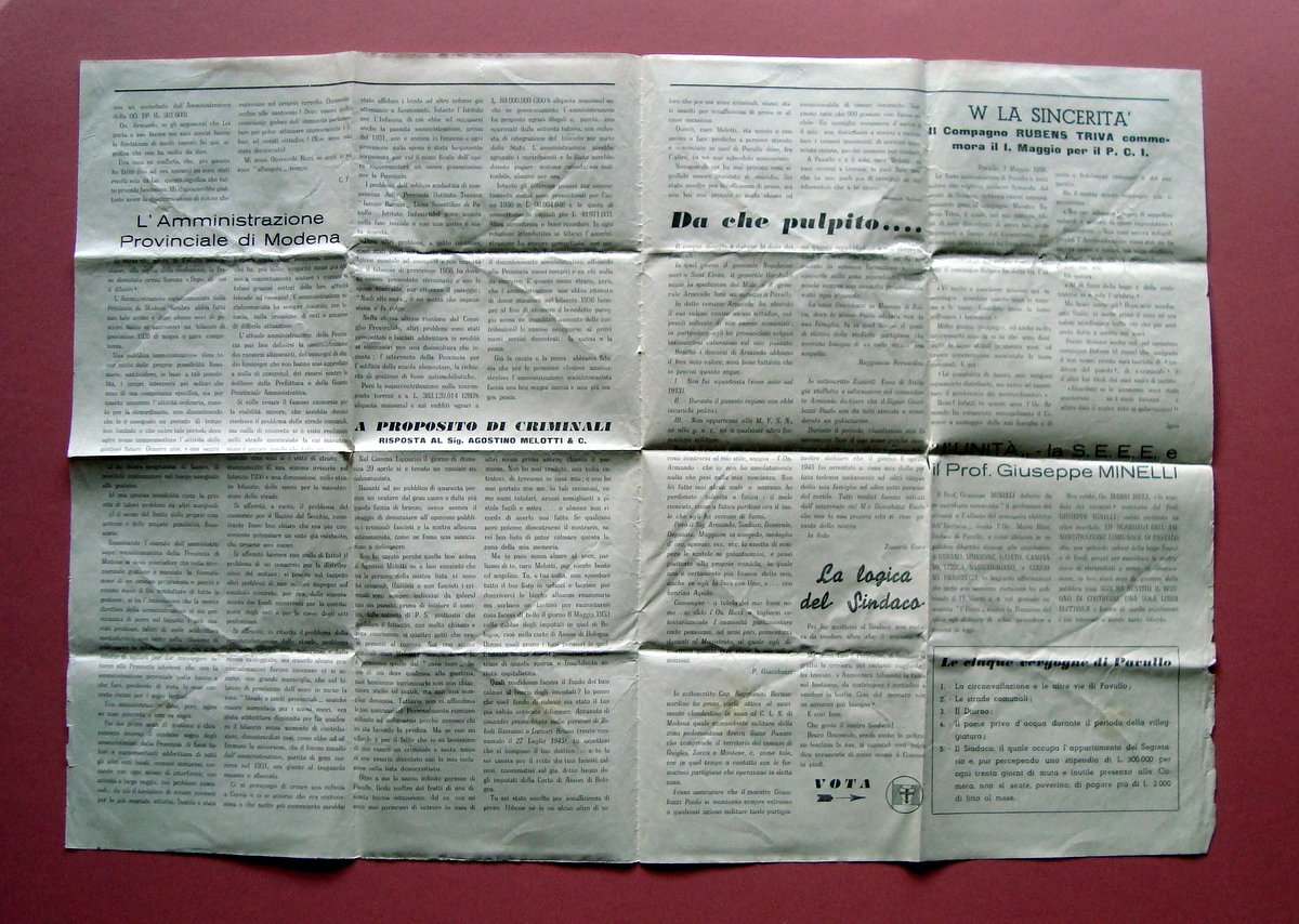 Supplemento, Democrazia" Modena, Maggio 1956 Anno VI Candidati Elezioni amministrative D.C. Pavullo Tip. Tirelli & Azzi, Pavullo, 1956; cm 44x32, pp. 4 (bifolio). Numero completo. Condizioni di conservazione Esemplare in buone condizioni con tracce d'uso, pieghe di conservazione e margini con piccoli strappetti; per le condizioni vedi foto. Numero completo. Candidati e problemi di Pavullo SC03.D19037 blu "