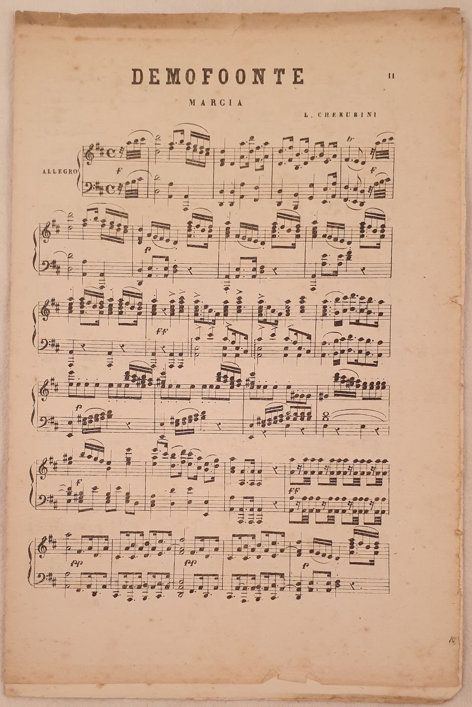 Edizione della fine ottocento di questo spartito per pianoforte del pezzo "Demofonte" del compositore Luigi Cherubini (1760-1842). All'interno spartito per marcia e sinfonia. Buone condizioni, qualche fioritura. qualche piccolo strappo marginale. In folio. cm 32x21,5. pp. 8. Edition of the end of 1800 of this musical score for piano "Demofonte" by the composer Luigi Cherubini (1760-1842). Good conditions, some foxings. Some little tear in the edges. In folio. cm 32x21,5. pp. 8.