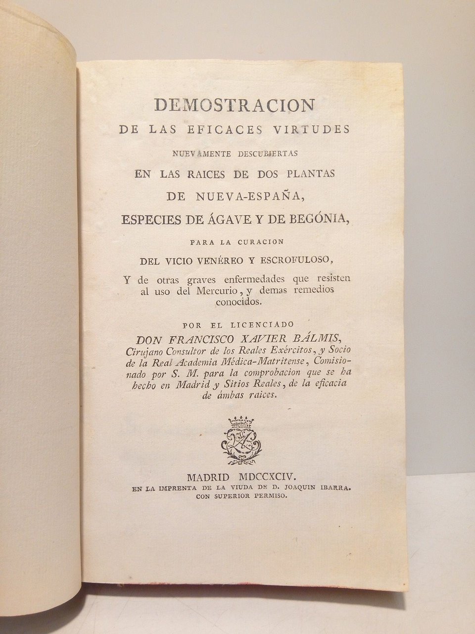 Demostración de las eficaces virtudes nuevamente descubiertas en las raices de dos plantas de Nueva-España, especies de Agave y Begónia, para la curación del vicio venéreo y escrofuloso, Y de otras graves enfermedades que resisten al uso del Mewrcurio, y demás remedios conocidos / Por el Licenciado Don Francisc Xavier Balmis, Cirujano Consultor de los Reales Exércitos, y Socio de la Real Academia Médica-Matritense, Comisionado por S. M. para la comprobación que se ha hecho en Madrid y Sitios Reales, de la eficacia de ámbas raices