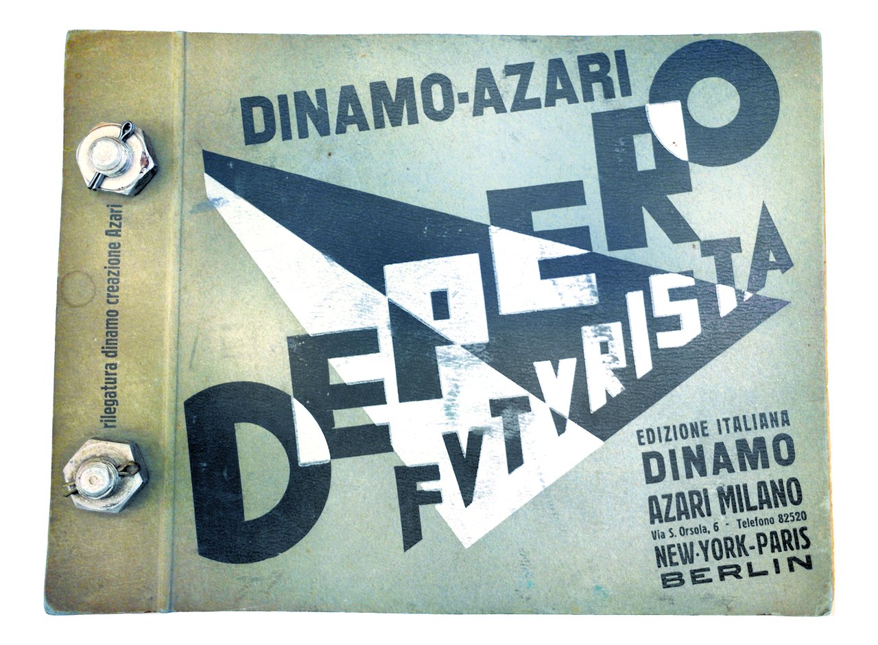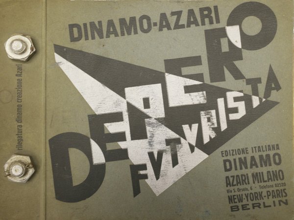 Mm. 242 x 318, insolita rilegatura editoriale in cartonato (lievi aloni) con ai piatti due bulloni metallici; il libro è composto di 117 fogli (di cui uno doppio, inclusi quelli non impressi), per un totale di 234 pagine + 2 fogli di risguardo + 4 veline bianche (una porta a stampa: Mucca in montagna). Titolo al frontespizio stampato in blu e arancione; alcuni fogli sono in cartone o cartoncino colorato.Il libro è illustrato da numerosissimi disegni e bozzetti al tratto, da alcune bicromie, da riproduzioni fotografiche di cui 2 a colori; tra le foto: un ritratto dell'Autore, uno dell'editore Fedele Azari, una di Azari con Depero; e con composizioni parolibere. Copertina e grafica dell'Autore. Tiratura di 1000 esemplari. Fu realizzata anche un'edizione speciale con copertina metallica, destinata ad importanti personalità tra cui Marinetti e Mussolini. Cfr. Salaris Storia del Futurismo, p. 178: Sponsorizzato dalla Dinamo-Azari di Milano nel 1927, Depero ha pubblicato il notissimo libro imbullonato, sicuramente il più bell'esempio di tipografia futurista, senz'altro uno dei più importanti libri d'avanguardia del mondo. Si tratta di una edizione autopubblicitaria, concepita dall'artista roveretano per divulgare l'attività del suo laboratorio: in queste pagine di diversi colori troviamo riproduzioni di quadri, arazzi, disegni, progetti, brani di onomalingua, maquettes, ecc.; il tutto si avvale d'una insolita rilegatura.. Dice in proposito Depero: Questo libro è: "Meccanico" imbullonato come un motore "Pericoloso" può costituire un'arma proiettile "Inclassificabile" (..) non sta bene in libreria e neppure sugli altri mobili che potrebbe scalfire. Perchè sia veramente al suo posto, deve essere adagiato sopra un coloratissimo e soffice-resistente "Cuscino Depero". Esemplare con piccola macchia d'inchiostro blu al frontespizio, altrimenti ben conservato. Con dedica e firma autografa al verso del frontespizio A Cainelli / la mia simpatia / Fortunato Depero / 5.11.XV°.