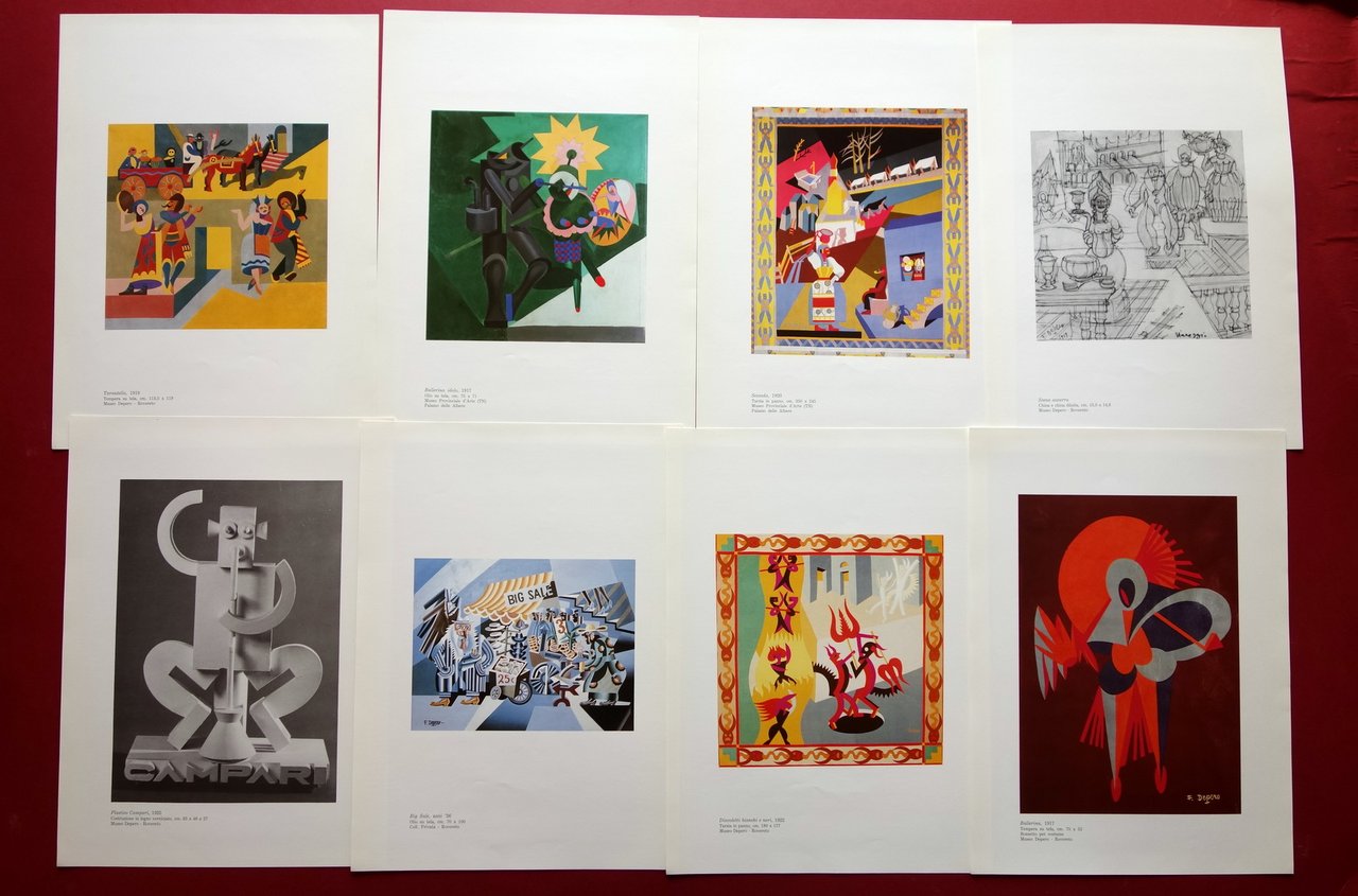 Cartella (catalogo di mostra), Studio Kronos - centro ricerche espressive Pistoia - Depero Magico Comune di Viareggio - Assessorato alla Cultura Fondazione Carnevale di Viareggio [.] Tellini, Pistoia 1987; cartella costituita da fascicolo di pp. 24, con tre ill. in b/n, e da 15 tavole sciolte ill. in b/n e a colori (elenco delle opere esposte pi√π riproduzioni a colori delle opere di maggior rilievo); fascicolo di testo e tavole sono inserite entro custodia in cartoncino ed. Cm 34x24,5 (fascicolo); cm 37x27 (tavole). Condizioni di conservazione Fascicolo di testo e tavole molto ben conservati con minimi segni di utilizzo. Custodia in cartoncino con alcuni lievi aloni e accenni di sporco, qualche leggera marginale sgualcitura / ammaccatura; al dorso tre minuscoli poco visibili taglietti orizzontali (vedi foto). Non comune catalogo di mostra su Depero. SC03.D16305 N F