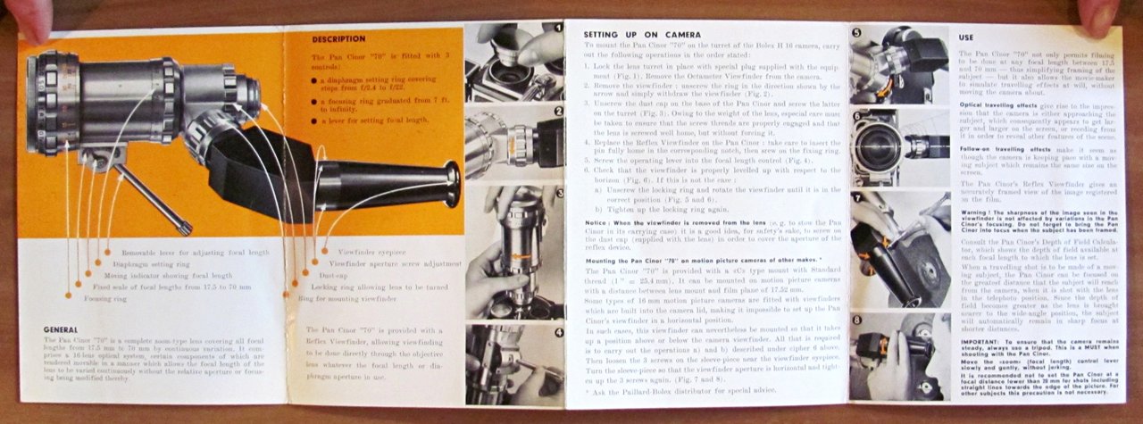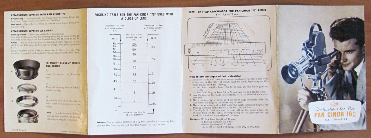 Depliant Pan Cinor 16mm, Instructions for use. Illustrazioni fotografiche dimostrative in b/n n.t. , s.d. anni 1960 circa. Brochure editoriale apribile che illustra il funzionamento dell'obiettivo. Chiuso 11x15; Aperto 44x15. Ottimo stato. , Ottimo (Fine)