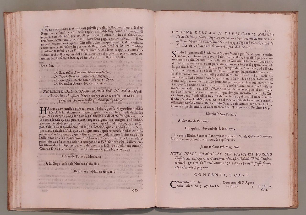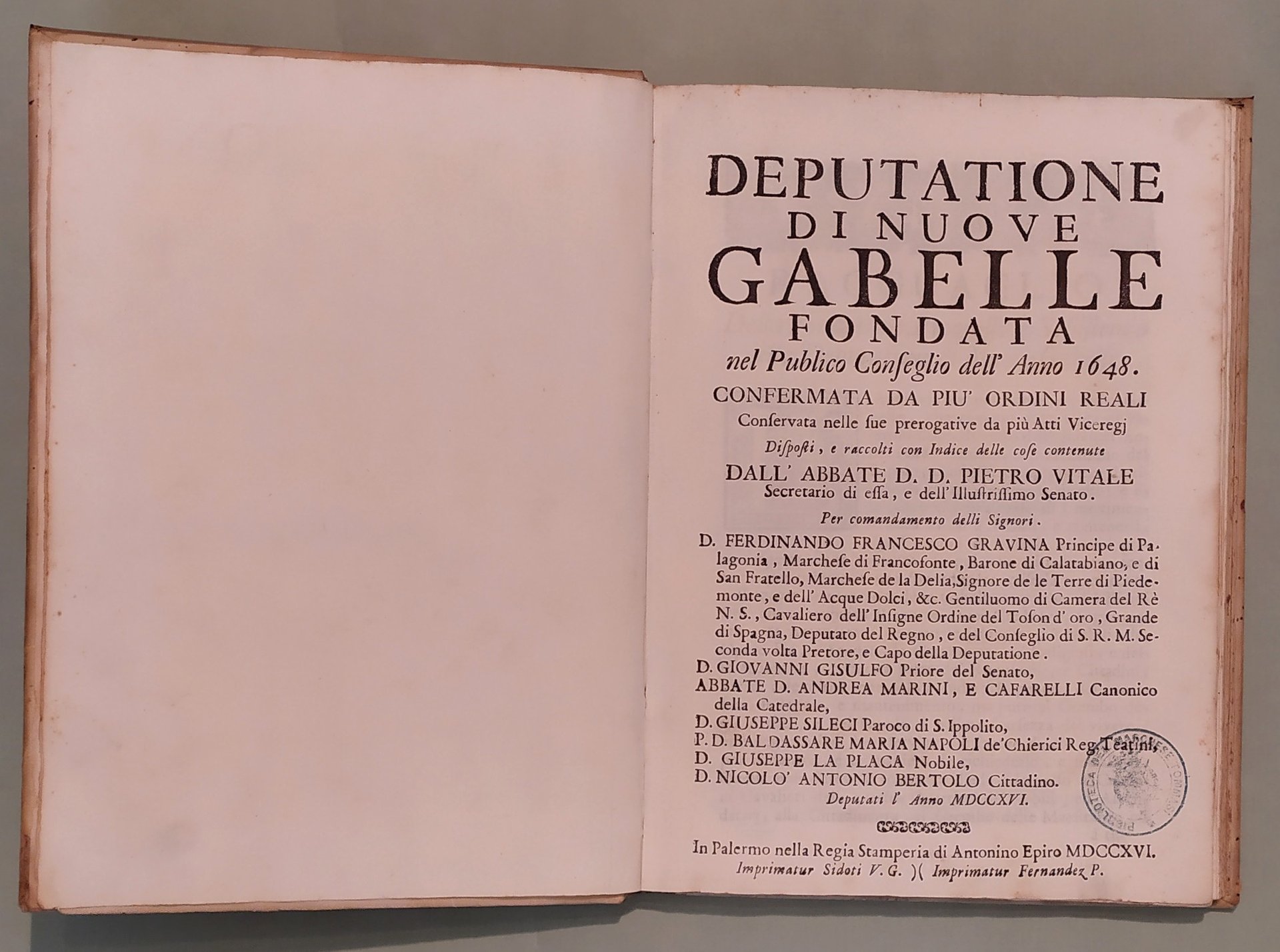 Deputatione di nuove gabelle fondata nel pubblico Conseglio dell'anno 1648. Confermata da più ordini reali conservata nelle sue prerogative da più atti viceregi.