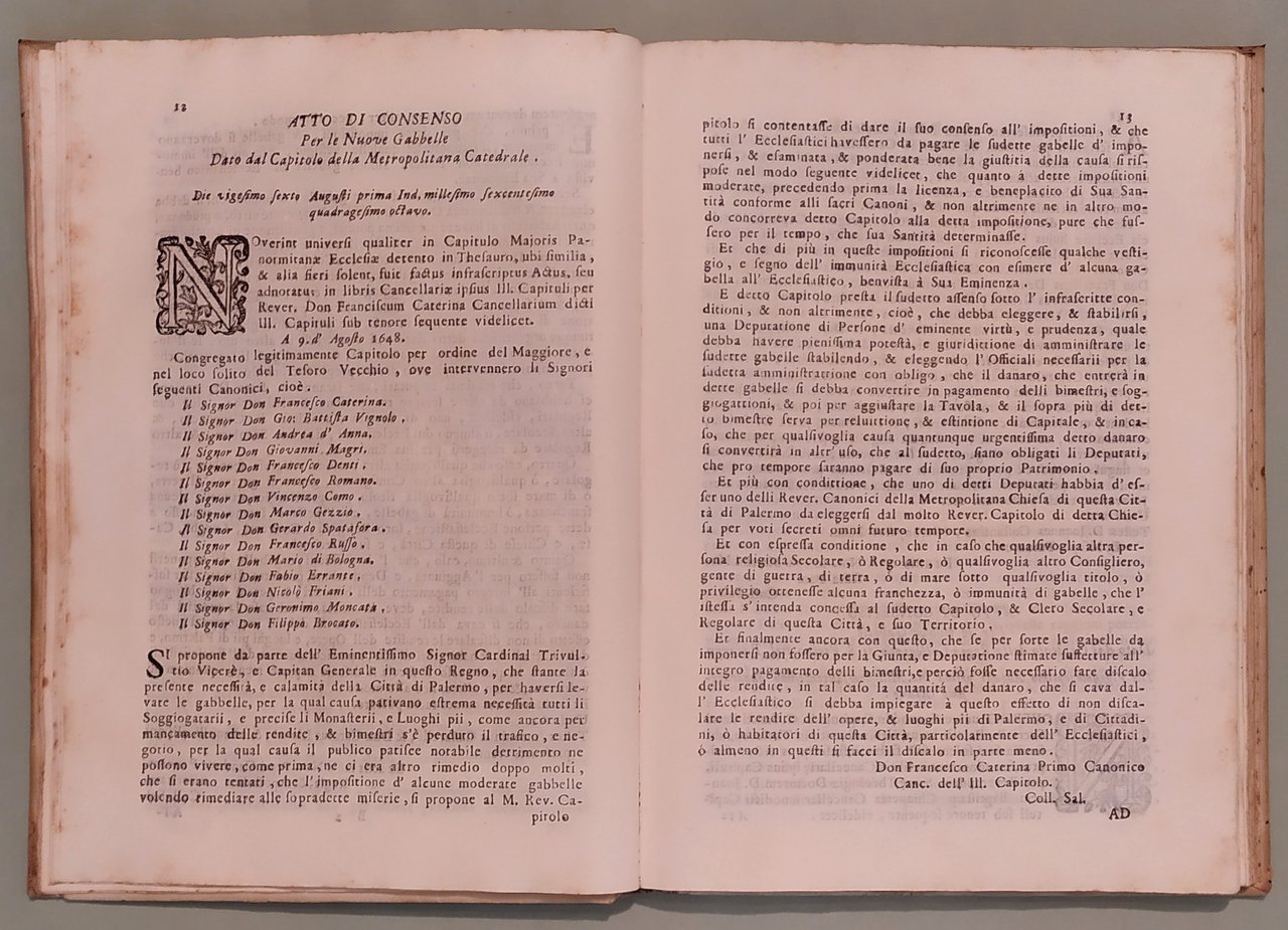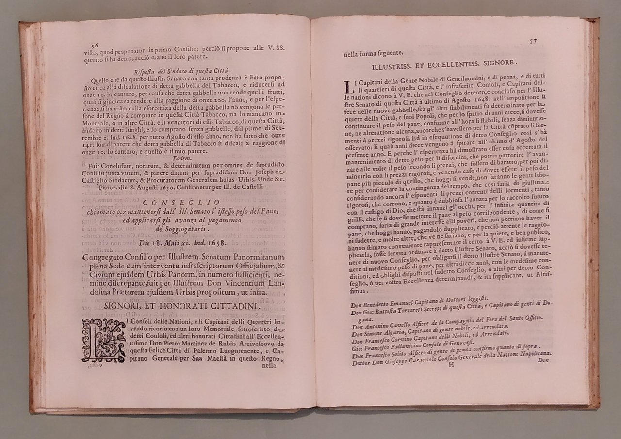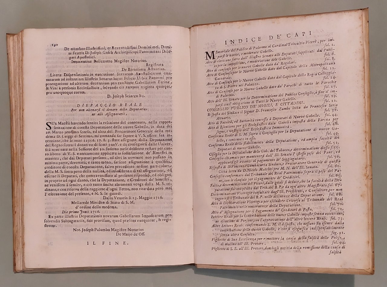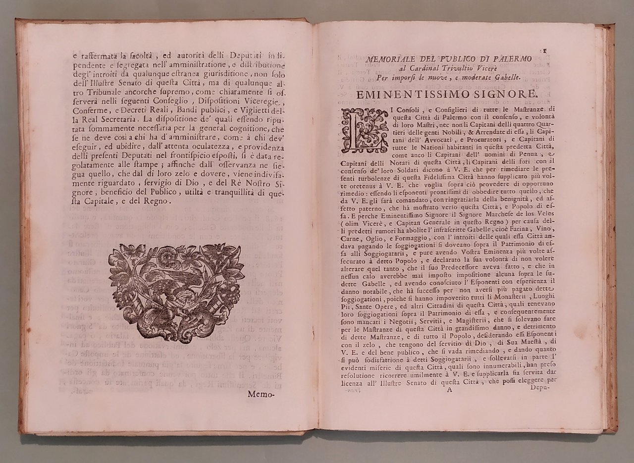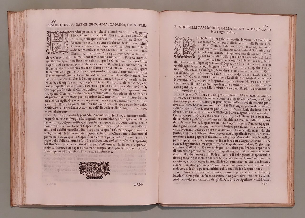 Palermo, Antonino Epiro, 1716. In 8vo; pp.6n.nn.,190. Testate, capilettera e finaletti silografati. Pergamena coeva. Un'accurata disamina delle condizioni di vita del popolo palermitano attraverso lo studio delle disposizioni amministrative in vigore in Sicilia. Narbone II, pag. 165; Mira II, pag. 470.