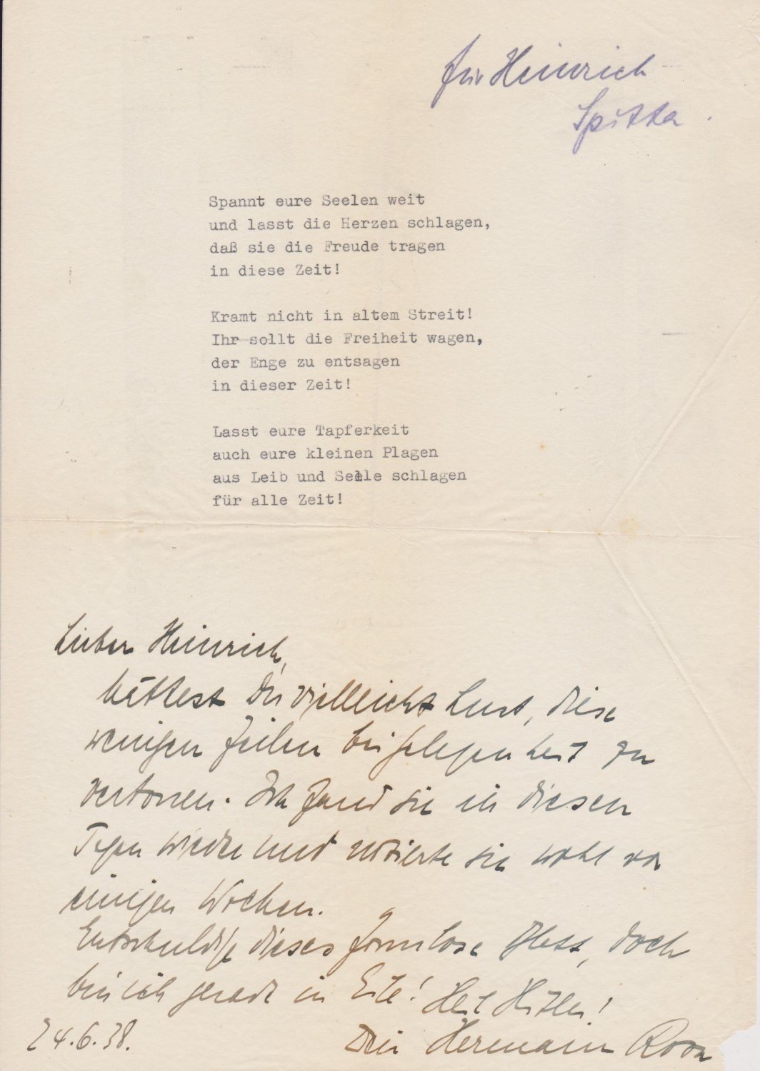 Mit einer Beilage: A4 Blatt mit einem maschinegeschriebenen Gedicht und einem handschriftlichen, datierten und signierten persönlichen Text an den Komponisten Heinrich Spitta.