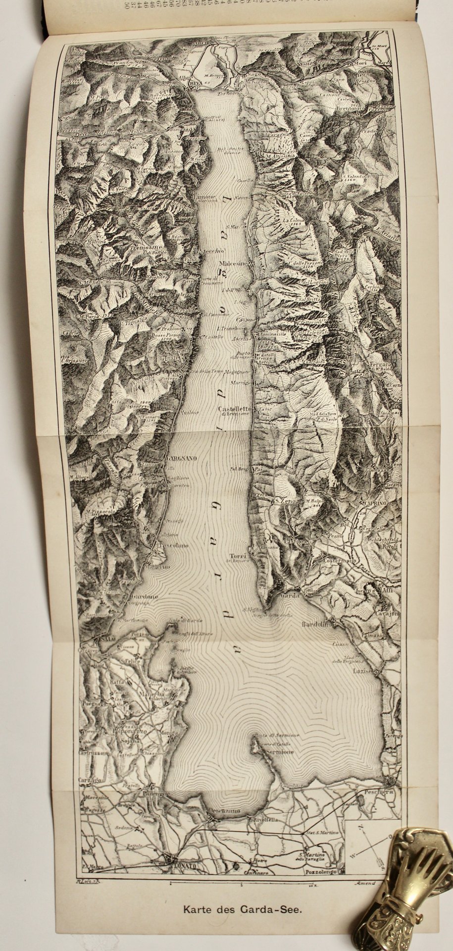 Due volumi in un tomo in 16° (mm 175x120); pagg. 89 con una grande carta del Garda rip. più volte, una tavola f.t. a doppia pag. di Gardone Riviera ed una decina di altre vedute a tutta pagina oltre a decine di illustrazioni nel testo su disegno di Carl Dietrich; pagg. 96 con 31 vedute ed una pianta di Salisburgo. Legatura posteriore in mezza tela con angoli con titolo in oro al dorso, che protegge le brossure editoriali policrome illustrate con vedute in copertina enpianta di Salisburgo al verso della seconda opera. Il primo tomo descrive ad opera di Joseph Fischer inizialmente la nuova ferrovia che partiva da Mori e raggiungeva Arco e Riva, inaugurata appunto nel 1891. Continua poi con descrizione di tutti i paesi del circondario compresi Torbole, Nago, Tenno, Tremosine, Malcesine. Una seconda parte riguarda invece la riviera bresciana. Dalla serie "Städte-Bilder und Landschaften aus aller Welt"