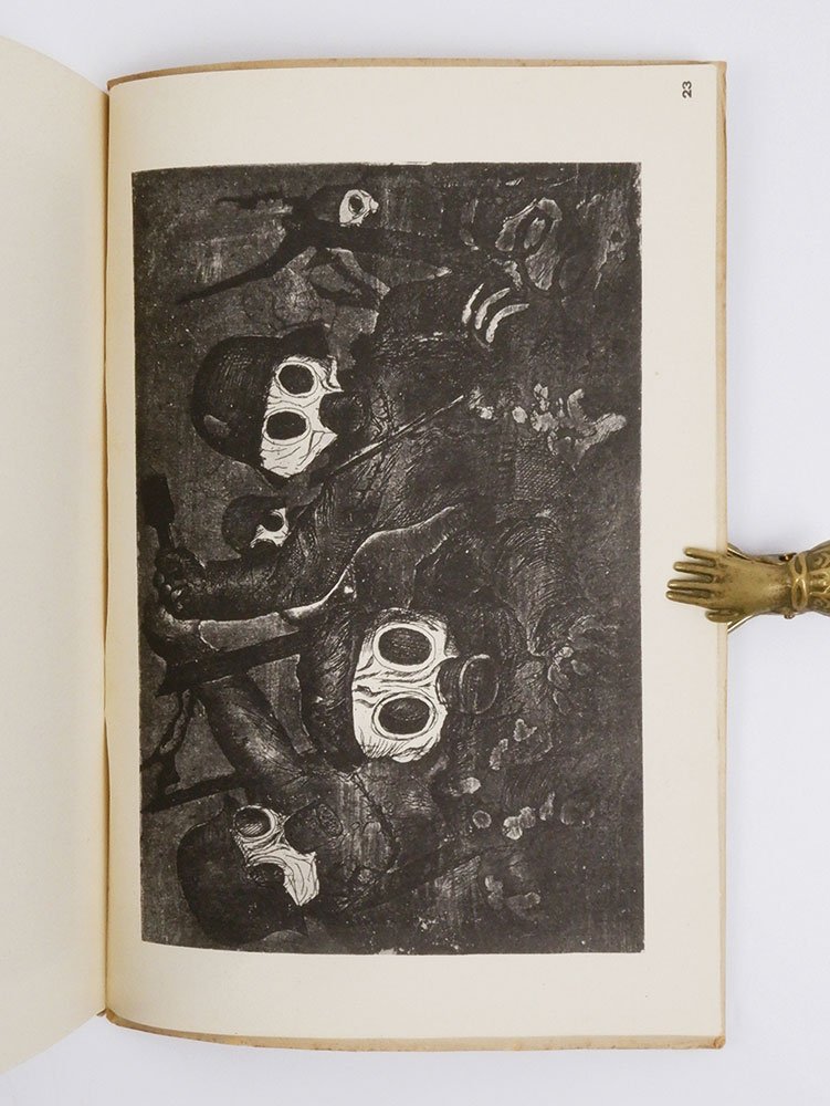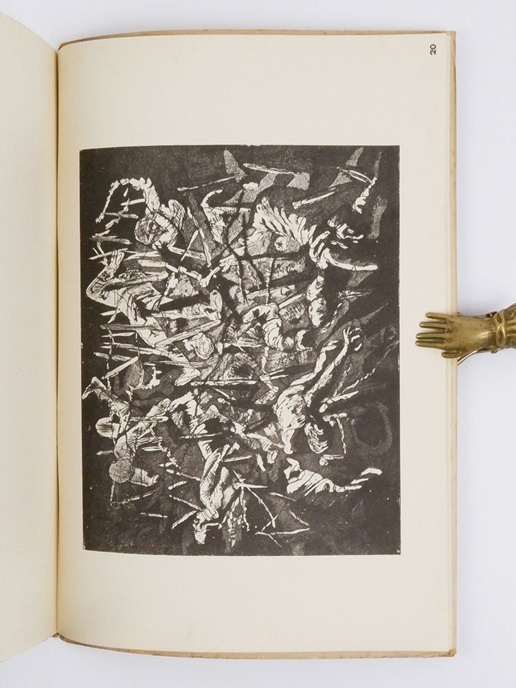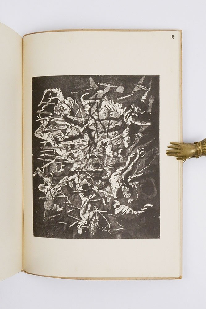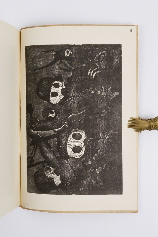 - brossura in cartoncino illustrato in bianco e nero (particolare di «La guerra durante un attacco di gas»),