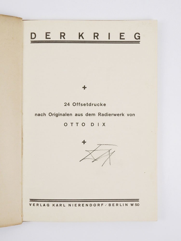 LIBROPrima edizione nella tiratura commerciale in ottavo.CON AUTOGRAFO.Esemplare in ottimo stato di conservazione (minimi restauri professionali al dorso a fermare contenute lacerazioni, strappetto non deturpante al piede della cerniera anteriore), fresco e pulito, pregiato dall’iconica firma autografa dell’artista sul frontespizio.Volontario durante la prima guerra mondiale, che lo vide impegnato sia sul fronte orientale sia sul fronte occidentale, ferito e decorato per il suo valore, Otto Dix uscì dalla drammatica esperienza bellica profondamente traumatizzato, come testimoniano in modo tragico e straordinario le cinquanta incisioni contenute nel portfolio «Der Krieg» pubblicate a Berlino da Karl Nierendorf nel 1924 in soli settanta esemplari. Nello stesso anno, Nierendorf diede alle stampe anche una tiratura commerciale – a cui appartiene il volume qui presentato – del ciclo «Der Krieg», contenente la riproduzione in formato ridotto delle tavole originarie. Come Francisco Goya con le sue 82 incisioni appartenenti al ciclo «Los desastres de la guerra» ha sottratto una delle più importanti e sanguinose pagine delle guerre napoleoniche dalla storia dei conflitti per consegnarla, attraverso immagini vive e terribili, alla più vasta storia delle atrocità umane (e alla storia dell’arte), così Otto Dix con «Der Krieg» ha lasciato indelebile, visionaria e feroce traccia della Prima guerra mondiale. -- Pubblicata in pieno periodo weimariano, quest’opera mostra una chiara volontà di ricordare a una Germania già attraversata da nuove, pericolose, fantasie di rivalsa, vendetta e distruzione, ciò che la guerra, fuori da qualunque mitologia, realmente è. Catalogato, dopo il 1933, come “artista degenerato” dai nazisti e costretto ad abbandonare l’incarico ottenuto nel 1931 all’ Università di Dresda, Dix si ritirò a vivere sul lago di Costanza abbandonando i temi sociali per avvicinarsi a paesaggi e a ritratti: opere meno esasperate stilisticamente, attente a cogliere l’interiorità dei personaggi raffigurati.