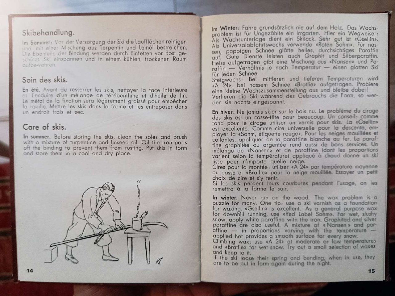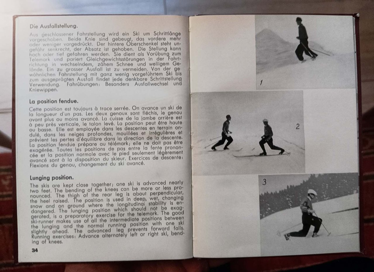 >in-12, (mm 150 X 105), pp. 64. Testo in tedesco, francese e inglese. Leg. fig. in cartone editoriale. Interessante monografia dedicata alla tecnica sciistica a partire dall'abbigliamento, alla cura degli sci, alla ginnastica presciistica, alle tecniche di discesa (Cristiania, telemark) adorna di numerose pagine con riproduzioni fotografiche.