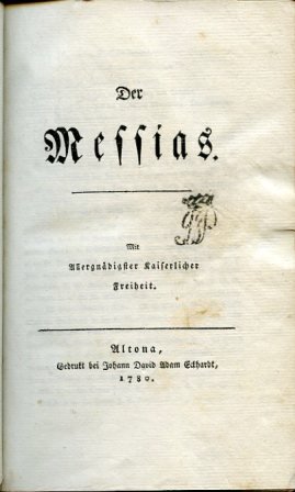 In-8°, pp. (16), 673, (2), 7, (2), legatura coeva p. pelle con dorso a nervi adorno di titolo in oro su tassello arancio, filetti, fiorellini e tralci vegetali in oro entro scomparti. Tagli rossi, sguardie decorate a motivi geometrici in rosso e in verde. Testo in carattere gotico. Un timbro di privato possesso nobiliare. Alcuni restauri alla legatura,qualche lieve fioritura interna, ma ottimo esemplare nel complesso. Edizione definitiva del maggior poema religioso della letteratura tedesca, celebrazione in venti canti in esametri, di elevata ispirazione pietista, della passione di Gesù Cristo e dell'opera del Messia di mediazione tra la divinità e l'uomo. In parte ispirato al modello di Milton, il poema fu fra l'altro molto ammirato da Goethe, che estesamente ne parla in 'Poesia e verità'. 'L'apparizione del poema nel mondo letterario e religioso del suo tempo fu un vero e proprio avvenimento, sia perché rappresentò la liberazione dalla tormentosa inquietudine del fanatismo pietista in una fede sana, sia perché stilisticamente il Klopstock fece dell'esametro un metro prettamente tedesco imprimendo nuovo vigore e nitore alla lingua poetica. esso rappresenta. una svolta nella letteratura tedesca e bastò qualche decennio perché venisse rivalutato tanto nella sua importanza storica, quanto nel suo valore politico' (Giovanna Federici Ajroldi in Diz. Bompiani d. Opere, IV, 689-690). Boghardt-Schmitt, Drucke von Klopstocks Werken, 3035. Goedeke, IV/1, 166, 6. WG, 32. Kippenberg, 5512. Neufforge, 133. Borst, 7. Sickmann, Klopstock und seine Verleger in Archiv für Geschichte d. Buchwesens, III, 196: 'Sein letztes selbstverlegtes Werk . ist die sogenannte Altonaer Ausgabe . von 1780'.