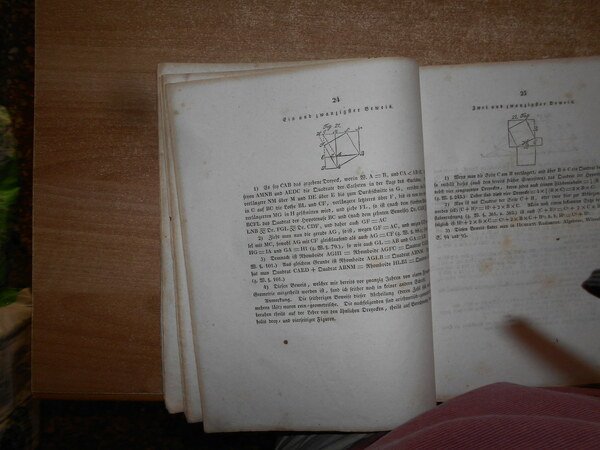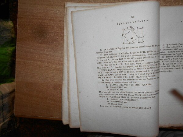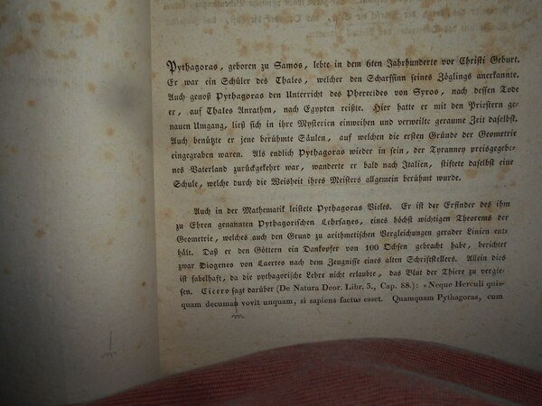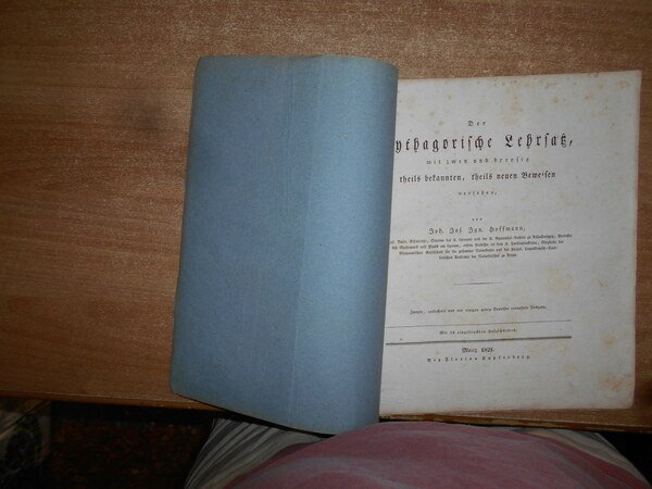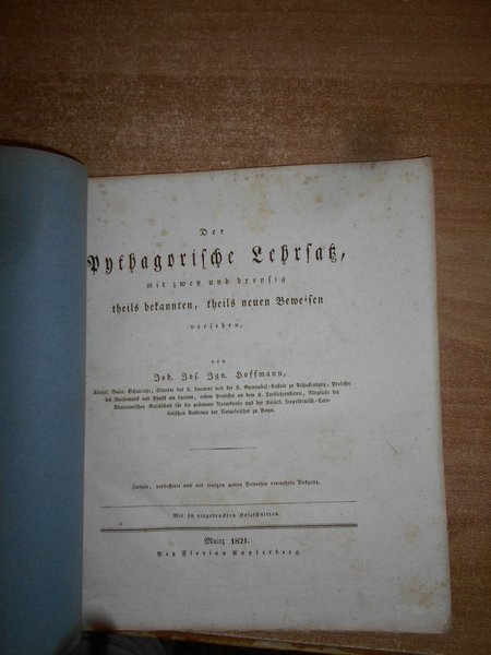 JOH. JOF. HOFFMANN. Mainz, Florian Kuppepferberg, 1821. Der PYTHAGORISCHE Lehrsak mit und Brensig theils Betannten theil neven beweisen. In-4°, br. muta. xii, 44 pp. con figure nel testo. Descrive il Teorema di Pitagora. Contempla i numeri, le forme geometriche e descrive anche Euclide. Opuscolo ben conservato con dorso consumato ma ben legato e lievi fioriture in poche pagine. Vendibile solo in Italia. Neg. scat. 2 opusc. nonn.