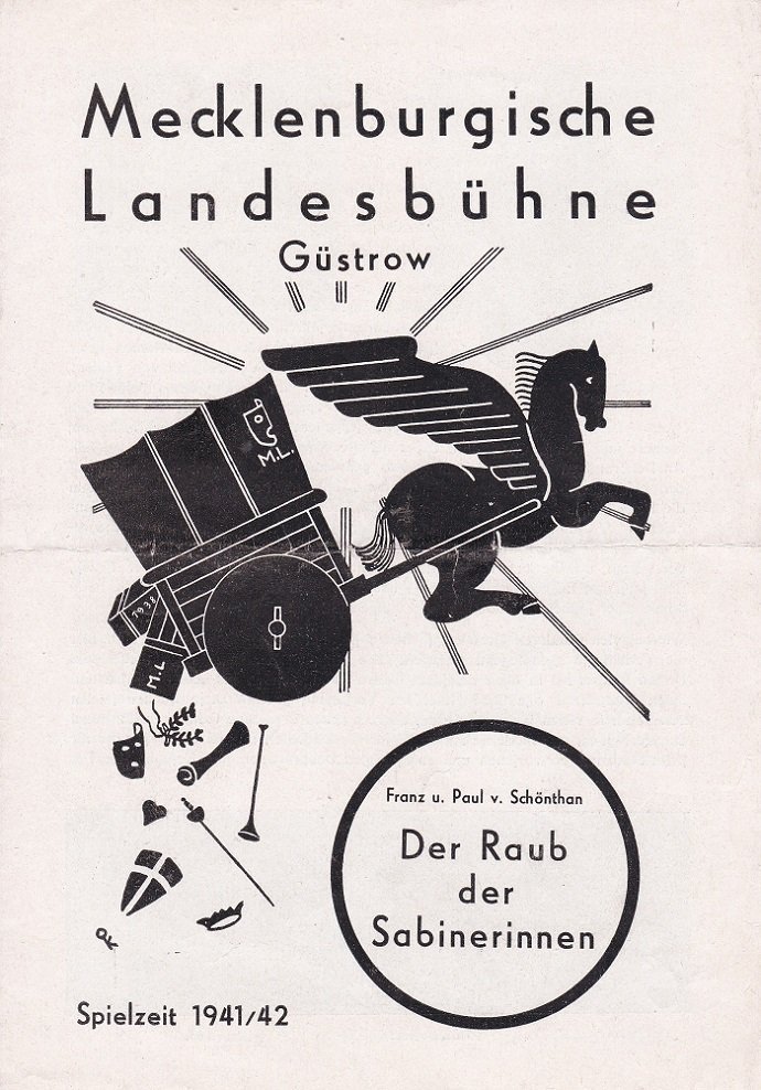 Inszenierung von Regisseur: Paul Schulz-Wernburg, Bühnenbild: Otto Kähler. Schauspieler/innen waren u.a.: Willy Arnhold, Charlotte Galdern, Ruth Schmittinger, Ursula Hastedt. Intendant: Paul Schulz-Wernburg. Programmzettel enthält Texte und Abbildungen zum Stück sowie auch die Besetzungsliste. Seltene Archivalie zur Theatergeschichte Mecklenburgs im Nationalsozialismus!