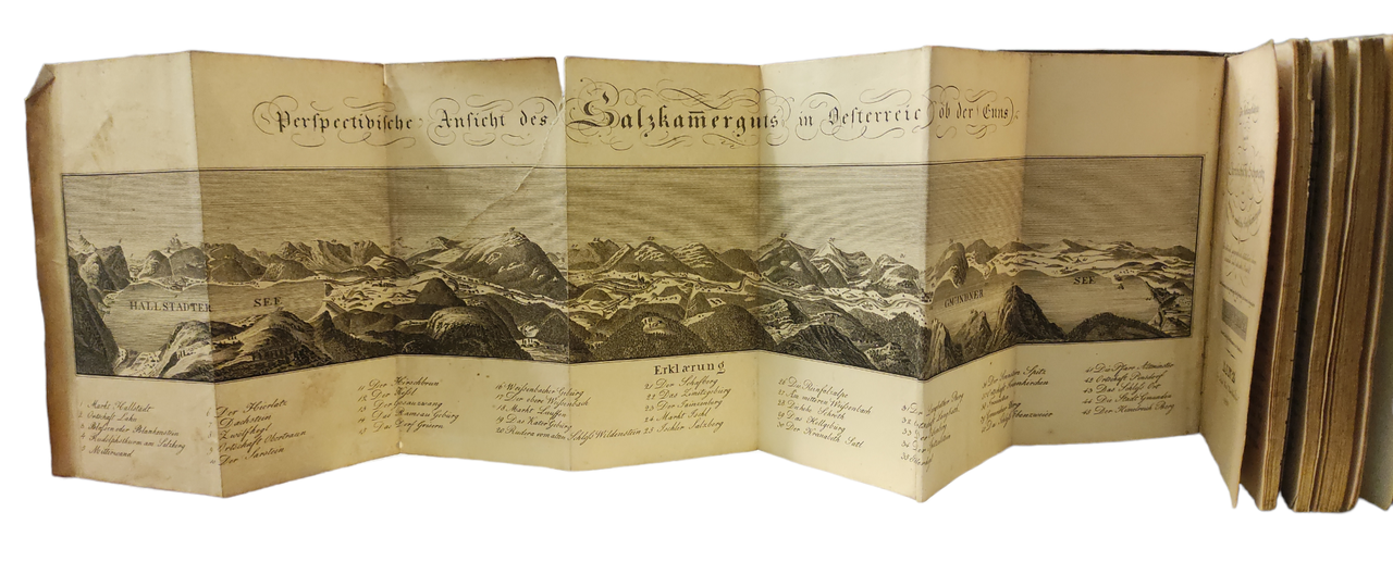 "In historisch, geographisch, statistisch, kammeralisch, und pitorscsker Ansicht. Ein Taschenbuch zur geseeligen Begleitung in diesen Gegenden". 2 tavv. f.t., una delle quali rappresentante veduta più volte ripiegata (antico restauro sul retro) in ottavo leg. pelle con titolo e fregi in oro al dorso e ai piatti, tagli dorati pp. (X), 178, (6) Buono (Good) Buon es. ma con segni del tempo.