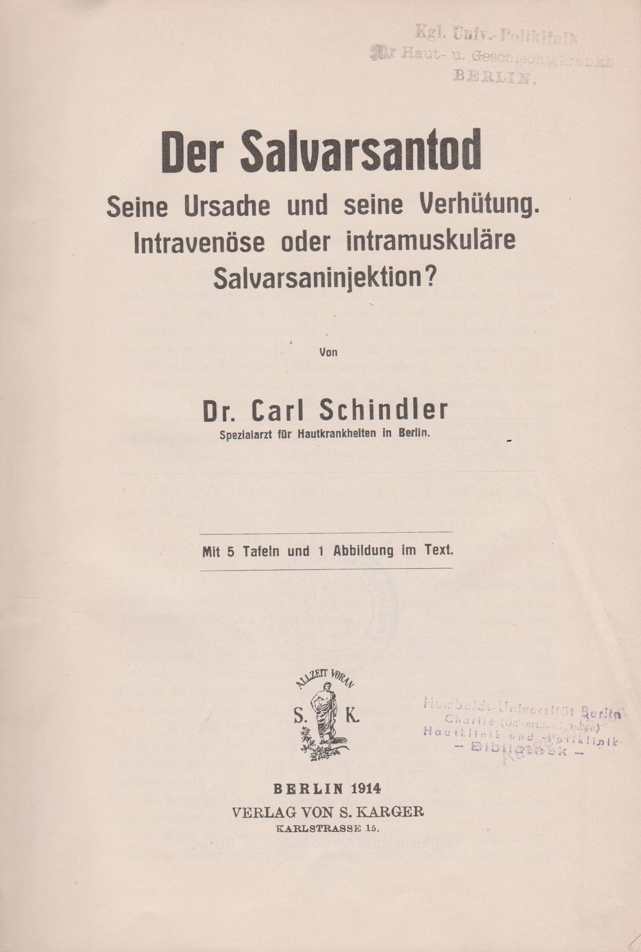 Mit einem Verfasser-Vorwort, 1 von 5 Abbildungs-Tafeln (Topographie der Glutealgegend rechterseits) sowie einer Textabbildung. Dr. Carl Schindler war Spezialarzt für Hautkrankheiten in Berlin.
