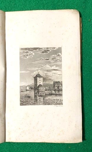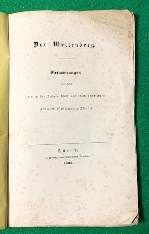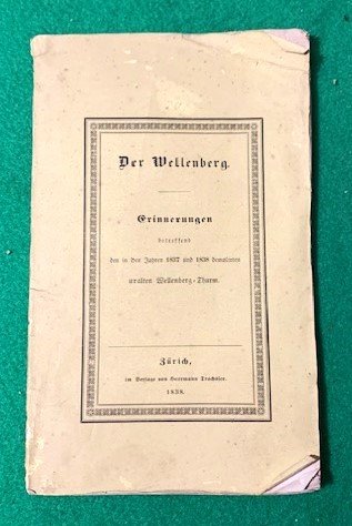 In 4° piccolo; 14, (2) pp. e 5 c. belle acqueforti. Brossura editoriale gialla con titolo impresso in nero, entro cornice, al paitto anteriore. Cornice al recto del piatto anteriore con una piccolo fregio con clessidra, al centro della cornice. Esiste almeno un esemplate con 6 tavole (ETH-Bibliothek Zürich, Rar 1347) ma l'opera è, in genere, accompagnata da 5 tavole. La sesta tavola non è mai stata aggiunta, come ben visibile dalla legatura originale, in questo esemplare che risulta genuino nella brossura e nel cordone che lo lega. Prima ed unica edizione di questa interessante storia della celebre torre-prigione di Zurigo, parte della prigione della Limmat, la Wellenberg che venne demolita nel corso dell'espansione della città. Le acquetinte mostrano, infatti, vedute esterne e spazi carcerari all'interno della stessa. Non comune a reprersi completo delle cinque tavole e della brossura originale. Rif. Bibl.: Holzmann//Bohatta VI,8308; Barth 18695; Appenzeller 17-21 und 264.
