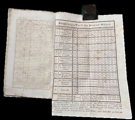 In 8° piccolo; 72, (2), 49, (3) pp. 3 carte, delle quali una più volte ripiegata inserite in numerazione nel testo. Brossura muta coeva in percallina azzurra. Primissima assai rara edizione tedesca, ne seguirono almeno altre tre nella prima metà dell'ottocento) di questo manuale per il giocatore del Boston-whist, conosciuto anche come Bostogné o Boston, celebre gioco di carte del XVIII secolo giocato in tutto il mondo occidentale tranne che in Gran Bretagna, che forma un collegamento evolutivo tra Hombre e Solo Whist. Il gioco, apparentemente prende il nome da un luogo chiave nella Guerra d'Indipendenza americana, masi crede sia stato ideato in francia intorno al 1770 combinando il mazzo da 52 carte e il sistema di classificazione logica del Whist in partnership con una gamma di giochi da solista e offerte di alleanza prese in prestito da Quadrille. Interessantissima la seconda parte dell'opera con frontespizio proprio che contiene 26 giochi di prestidigitazione con le carte tanto che quest'opera, in questa edizione, era presente anche nella celebre collezione di volumi di magia di Harry Houdini oggi conservata nella Library of Congress. Qualche leggero foxing, pagine con leggera ed uniforma brunitura e nel complesso, esemplare in buone-ottime condizioni di conservazione. Rif. Bibl.: Harry Houdini Collection (Library of Congress), GV1277 .H75 1830, 30033212.