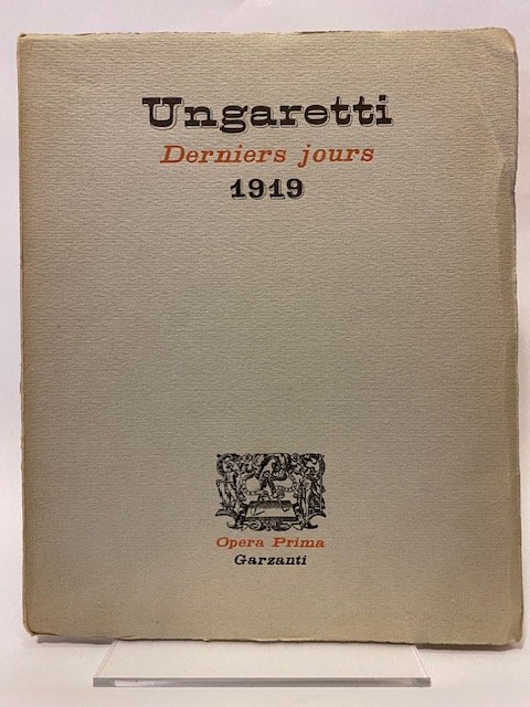 Brossura grigia, buona copia a bordi intonsi, carte fragili e brunite ai margini. Nella pregiata collezione «Opera prima», curata da Enrico Falqui per Garzanti in tiratura limitata a 200 esemplari numerati su carta di pregio, quindici copie nn numerate per il servizio stampa, la presente copia, in carta normale, è la numero 1 riservata all’autore. Vengono qui ripubblicati «I diciotto componimenti di “La guerre” [.] stampati per la prima volta, in un’edizione di ottanta copie, a Parigi, nel 1919. Un quaderno allegato riproduce la foto dell'autore in uniforme da soldato e la copertina della prima edizione di "Allegria di naufragi" per Vallecchi. Collana «Opera prima» a cura di Enrico Falqui