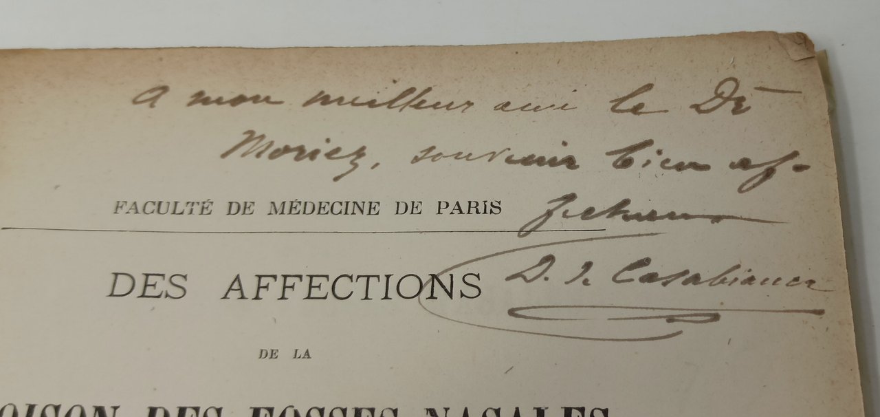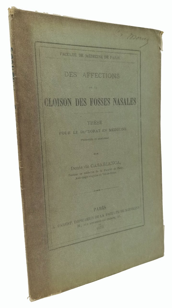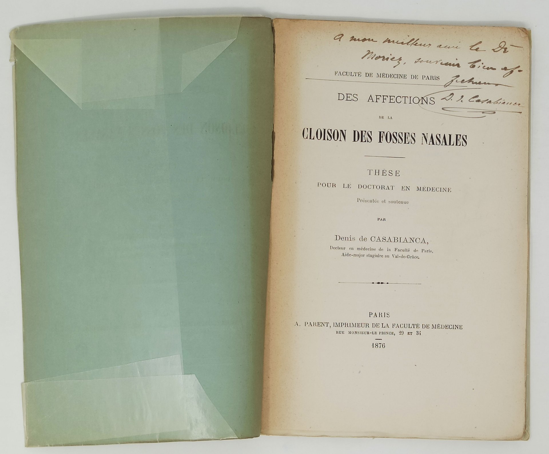 Rara edizione originale, con dedica e autografo dell'autore. Lingua del testo: Francese. Dimensioni: 15,5 x 25 cm circa. 81 pagine. Stato di conservazione: un taglio di circa 9 cm sul margine superiore della copertina anteriore (in corrispondenza dell'attaccatura al dorso), una firma d'appartenenza a penna (del Dr Moriez al quale è stata dedicata e regalata questa copia direttamente dall'autore dell'opera). Nel complesso, un esemplare decisamente ben conservato. Interno molto fresco. Privo di scritte o segni nel testo. Sul margine superiore del frontespizio è presente, a penna, una dedica (al Dr Moriez) autografata dall'autore (D. de Casabianca). Edizone originale (edita nel 1876) di un'opera che è stata ristampata in anni recenti. Da collezione. Di assai difficile reperimento. Copertina flessibile con camicia editoriale in carta velina.