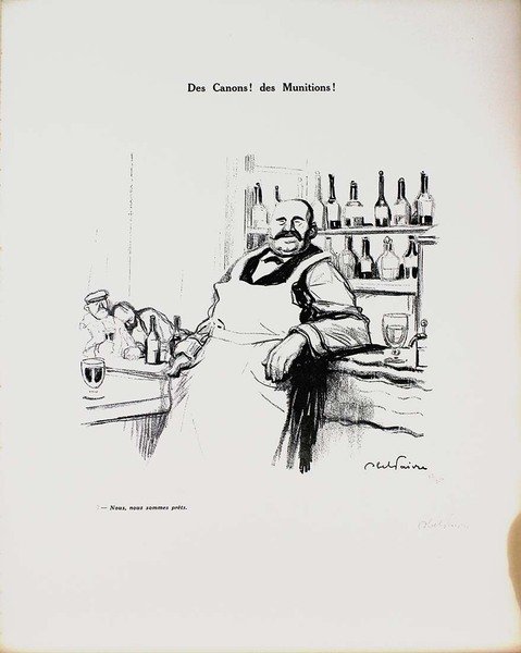 Abel Jules Faivre (Lione 1867 - Nizza 1945) Litografia originale firmata a mano dall'artista.Dimensioni: 56 x 38,5 cmCon certificato di autenticità C.O.A.Ingiallimento laterale come da foto.Esemplare numero 62/250 La raccolta di litografie umoristiche del caricaturista francese Abel Faivre (Lione 1867-Nizza 1945), andata a confluire nel volume Jours de guerre,fu pubblicata in due tomi tra il 1915 e il 1919. Con il procedere del conflitto, l'opinione pubblica di tutti i paesi coinvolti,che aveva dapprima affrontato tale evento con ottimismo, mutò rapidamente opinione sino a considerare la guerra, senza mezzi termini,come un avvenimento rovinoso. In tale contesto, le vignette satiriche di guerra possedevano un potente effetto catartico,adempivano un ruolo sociale irrinunciabile, fornendo una valvola di sfogo all’incombere dal più cupo pessimismo. Abel Jules Faivre (Lyon 1867 - Nizza 1945) Originale Lithographie vom Künstler von Hand signiert.Abmessungen: 56 x 38,5 cmMit Echtheitszertifikat C.O.A.Seitliche Vergilbung wie auf dem Foto.Kopieren Sie die Nummer 62/250 Die Sammlung humorvoller Lithographien des französischen Karikaturisten Abel Faivre (Lyon 1867-Nizza 1945), die in den Band Jours de guerre floss,es wurde zwischen 1915 und 1919 in zwei Bänden veröffentlicht. Im Verlauf des Konflikts wurde die öffentliche Meinung in allen beteiligten LändernWer dieses Ereignis anfangs mit Optimismus konfrontiert hatte, änderte schnell seine Meinung, um den Krieg ohne Zweifel zu betrachten.wie ein ruinöses Ereignis. In diesem Zusammenhang hatten die satirischen Kriegskarikaturen eine starke kathartische Wirkung.Sie erfüllten eine unverzichtbare soziale Rolle und bildeten ein Entlastungsventil gegen den dunkelsten Pessimismus. Abel Jules Faivre (Lyon 1867 - Nice 1945) Lithographie originale signée à la main par l'artiste.Dimensions: 56 x 38,5 cmAvec certificat d'authenticité C.O.A.Jaunissement latéral comme sur la photo.Copie numéro 62/250 La collection de lithographies humoristiques du caricaturiste français Abel Faivre (Lyon 1867-Nice 1945), qui allait se fondre dans le volume Jours de guerre,il a été publié en deux volumes entre 1915 et 1919. À mesure que le conflit progressait, l'opinion publique de tous les pays impliqués,qui avait d'abord fait face à cet événement avec optimisme, a rapidement changé d'avis pour envisager la guerre, en termes non équivoques,comme un événement ruineux. Dans ce contexte, les caricatures de guerre satiriques ont eu un puissant effet cathartique,ils remplissaient un rôle social indispensable, fournissant une soupape de décharge du pessimisme le plus sombre. Abel Jules Faivre (Lyon 1867 - Nice 1945) Original lithograph signed by hand by the artist.Dimensions: 56 x 38.5 cmWith certificate of authenticity C.O.A.Lateral yellowing as in the photo.Copy number 62/250 The collection of humorous lithographs by the French caricaturist Abel Faivre (Lyon 1867-Nice 1945), which went to flow into the volume Jours de guerre,it was published in two volumes between 1915 and 1919. As the conflict progressed, public opinion in all the countries involved,who had initially faced this event with optimism, quickly changed his opinion to consider the war, in no uncertain terms,like a ruinous event. In this context, the satirical war cartoons had a powerful cathartic effect,they fulfilled an indispensable social role, providing a relief valve from the darkest pessimism.