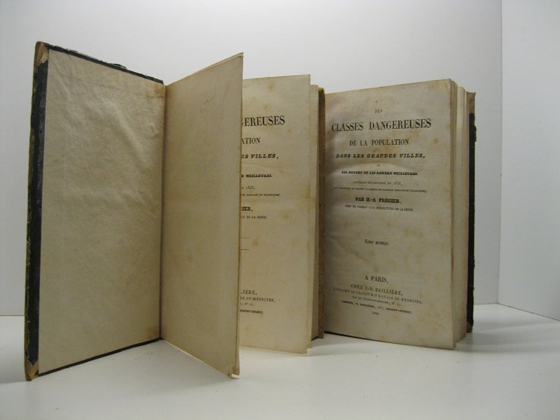 2 voll. in 8, pp. XII + 436; (4) + 528. Marm. M. pl. coeva con fr. al d. Ed. orig. Importante opera che ebbe grande influenza ai suoi tempi. Viva testimonianza del degrado delle masse proletarie inurbate, in particolare a Parigi. Manifesto di quel tipo di criminologia ottocentesca incentrata sulla difesa della societa' dai malvagi. Si fonda sul principio che, pur essendo gli operai di Parigi divisi in due classi, gli operai di bottega, dotati di maniere eleganti e compite, e gli operai delle fabbriche, rudi, ignoranti e grossolani, tutti sono comunque dominati dal vizio. Fregier porta l?esempio di quelle famiglie che tengono i figli sin verso i 12 anni a lavorare nelle fabbriche e nelle filature e poi li collocano presso qualche artigiano: si tratta di una soluzione per evitare che il fanciullo cada nella depravazione anzitempo. Descrive poi le gravidanze affrontate con sfrontatezza e disinteresse per la prole da parte delle giovani operaie e quanto queste si mostrino oscene e sguaiate all?uscita dalla fabbrica. Nell?affrontare il nodo dell?istruzione, l'A. afferma che l?istruzione del povero deve essere sorvegliata dall?autorita' alla luce dei pericoli rappresentati dalla stampa. Per ovviare all?incapacita' di educare i propri figli da parte di molte delle famiglie di operai, suggerisce che i fanciulli siano fatti vivere direttamente in fabbrica, cresciuti e nutriti dal padrone e, nei giorni di festa, portati a giocare nei campi sotto la sorveglianza degli operai piu' adulti. Il XIX secolo fu ossessionato dal terrore che i poveri potessero essere pericolosi. Nel XX si comincio' a ritenere che questo pericolo potesse essere ovviato con una combinazione di repressione e progresso sociale e che, complici anche due guerre mondiali, potessero essere le classi alte a rappresentare un pericolo. Siamo sicuri che il XXI secolo non possa rappresentare un inquietante ritorno alle dottrine di Fregier? Cfr. Foucault, Sorvegliare e punire, pp. 288; 310. Kress, C.5176. Einaudi, 2293. Palgrave, 27709.