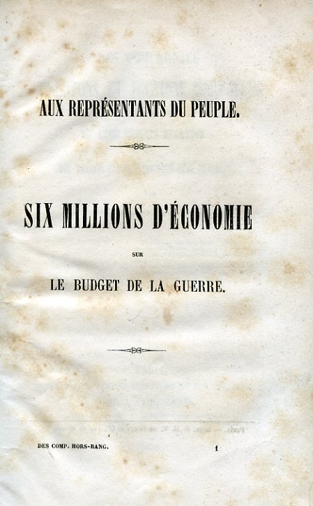 Des compagnies pelotons et sections hors rang. Examen de leur utilité relative et des raisons qui militent pour leur suppression [occhietto: Aux Représentants du Peuple. Six millions d'économie sur le budget de la guerre]